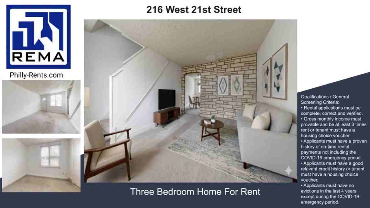 Virtual Tour: https my matterport com show ?m=o51L7vDpMzc This 930 sq. ft. residence in Chester, PA, offers a blend of classic charm and modern convenience across two floors. The home features three bedrooms, including a spacious 160 sq. ft. primary bedroom, and one bathroom. The layout includes two living rooms and a hallway, providing ample space for both relaxation and functionality. Throughout the house, neutral-toned carpeting covers most floors, creating a cohesive look. Large windows in various rooms allow natural light to flood the space, enhancing the bright and airy atmosphere. The living areas are characterized by clean white walls, some adorned with wainscoting that adds a touch of traditional elegance. One distinctive room showcases warm wood paneling on the lower half of the walls, introducing a rustic element to the home's overall design. The bathroom, while compact, offers modern fixtures including a vanity and a bathtub-shower combination. An interesting architectural feature is the decorative brick wall with an arched doorway, visible in one of the living spaces. This element adds character and visual interest to the interior. The home's layout, spread across two nearly equal-sized floors (470 and 460 sq. ft. respectively), ensures a balanced and efficient use of space. Located at 216 W 21st St, this property presents an opportunity for comfortable living in a modestly-sized yet well-designed home. Qualifications / General Screening Criteria: • Rental applications must be complete, correct and verified. • Gross monthly income must provable and be at least 3 times rent or tenant must have a housing choice voucher. • Applicants must have a proven history of on-time rental payments not including the COVID-19 emergency period. • Applicants must have a good relevant credit history or tenant must have a housing choice voucher. • Applicants must have no evictions in the last 4 years except during the COVID-19 emergency period. REMA LLC Jenkintown, PA https www reinfo411 com rentals