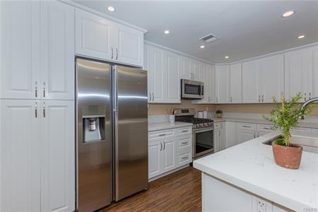Looking for a completely remodeled town home in an awesome Brea location??? Oversized kitchen has been remodeled and redesigned with white craftsman style cabinetry including soft close cupboards and drawers, quartz counters, stainless steel appliances, walk up pantry, LED recessed lighting, and stainless steel sink at the kitchen island which is open to the cozy living room with views of a beautiful back patio, complete with artificial grass, patio cover, and built-in herb garden. Downstairs powder room has a new vanity, mirror, toilet and faucet. Upstairs full bath features polished marble flooring, new white vanity with marble counter top, framed mirror, new lighting, new toilet, and new faucet. Entire home features all new baseboards, and casing, new interior doors with new hinges and knobs, recessed LED lighting throughout, new switches and outlets, all walls and ceilings have been retextured. Master bedroom offers two oversized closets, both with built-in closet organizers. Storage here is excellent, with an under the stairs storage closet, a utility closet, and a coat closet all on the main floor. The large 2-car attached garage is complete with heavy duty overhead storage racks, a work bench with storage cabinets, and laundry cupboards near the washer and dryer area. Location is ideal, close to Downtown Brea, shops, restaurants, and access to Brea schools!