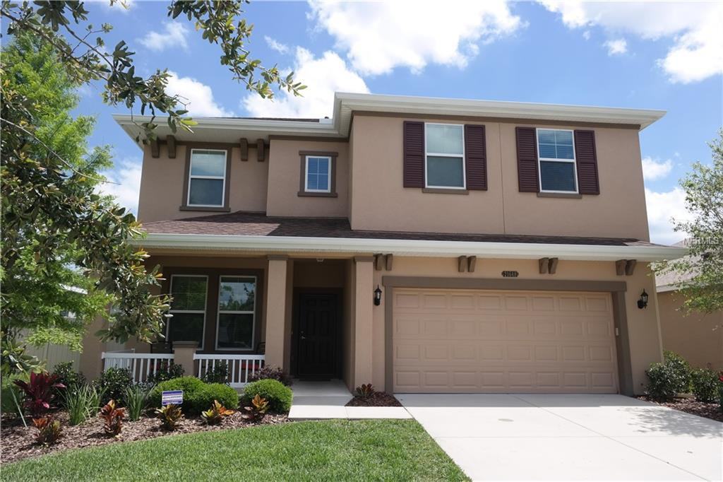 Nature surrounds this beautiful 5 bedroom 3 full bathroom home in Connerton with over 2500 sq ft of living space and a fully fenced in back yard with upgraded gutter system. This home boasts an open floorplan with a beautiful kitchen that offers granite counters, stainless steel appliances, island, eating space and a large pantry. The living room is large and open bringing in great natural light. There is a formal dining room perfect for entertaining. Downstairs offers one of the bedrooms and a full bathroom and built in surround sound system and alarm hookup. Upstairs you have a large loft along with the four additional bedrooms and 2 full bathrooms. Master bedroom is a great size and offers an ensuite bathroom with double vanity sinks, separate shower and garden tub and a large walk in closet! Connection offers a beautiful pool with mini water park, basketball, fitness center, tennis, and playground. The nature park is second to none with miles of beautiful preserve! Grass maintenance is paid for through December 2018.