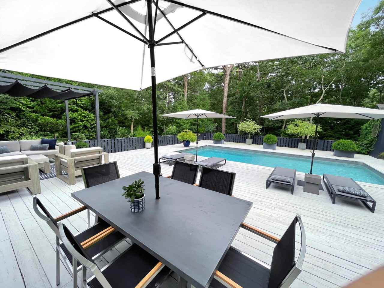 Rental Reg. # 26-135 This very stylish home located in the Northwest Woods of East Hampton features 3 bedrooms, 2 bathrooms, and a wonderful open dining/living room area with double height ceiling. The back of the house is lined with sliding glass doors which open on to the resort-like pool area surrounded by expansive decking and lush landscaping. A fabulous place to entertain or just relax. Listing ID: 754971
