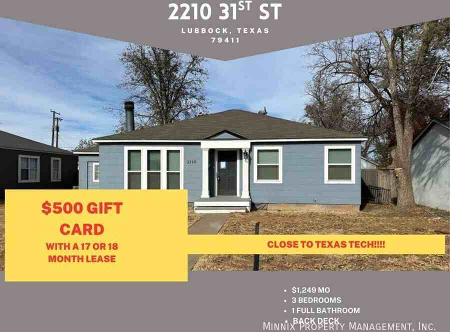 Receive a $500 gift card with a 17 or 18 month lease! A charming 3-bedroom, 1-bathroom home located in the heart of Lubbock, TX. This home is a perfect blend of comfort and convenience, featuring a dishwasher, a cozy fireplace, and ceiling fans for those warm Texas days. The hardwood floors add a touch of elegance, while the built-in bookshelves provide ample storage and display space. The kitchen is equipped with a stove/oven and a pantry for all your culinary needs. The dining area is perfect for hosting meals and gatherings. The home also offers a zero deposit move-in option for your convenience. The fenced yard, complete with a back deck and shed, offers plenty of outdoor space for relaxation or play. Pet lovers will appreciate that both dogs and cats are welcome. The home is also equipped with laundry hookups, central heat, and central air conditioning for your comfort. Parking is readily available. The home is located within the Lubbock Independent School District and is close to Texas Tech, making it an ideal location for those seeking a balance of educational opportunities and city living. Tenant is responsible for electric, water, and gas utilities. Offered by Minnix Property Management. This home is available for a 12-month lease. This property is available for self-guided tours! 7 am to 9 pm, 7 days a week! Pets are welcome with a $400 refundable per pet deposit. We comply with Fair Housing Guidelines when it comes to Service Animals and Emotional Support Animals. Vacant properties are held no more than 21-days. A deposit is required to hold the property. Renter’s insurance is required for all properties. $24.99/Month Minnix Resident Benefit Package: $0 Security deposit when using our deposit alternative that reduces your move costs. You may still use a traditional cash security deposit. Free Security Deposit Review - Don't agree with the charges at move out? Get a free independent review of your charges. Rent Plus - Credit reporting for on-time rent payments to build your credit! Automatically enrolled, opt out available. Flexible Payments - Administered by Best Egg Pay when you want so you can do more of what you want. Best Egg is built into your online portal that pays your rent on the first and allows you to pay back on your terms. Free Online eCheck - Pay your rent only with no additional fees if using the eCheck option. TXU Energy - $50 Visa gift card when you choose TXU as your energy provider using the promo code "RENT" through this link: https www txu com electricity-plans txu-elease?PromoCode=RENT Rent Check - Conveniently and easily document the condition of your residence when requested. DAVE - Get an advance up to $500. Get more money to help cover rent, fill your tank, tackle your to-do list, or take advantage of a now-or-never opportunity. Missed Appointment Fee Reimbursement - Missed that maintenance appointment? No worries, you may be eligible for reimbursement. Lockout Reimbursement - Reimbursement coverage just in case you do lock yourself out. Free Drain Maintenance Packs - Get a free supply kit to help with clogged or slow drain issues. Move-in Promise - Peace of mind that all maintenance requests made in the first 30 days are completed in 2 weeks! Overnight Stay Reimbursement - Maintenance issue force you to stay in hotel? Reimbursement available! Moving Concierge - Get personalized help for your move in or move out and more! Accidental Damage Coverage - Get $1000 back on accident..