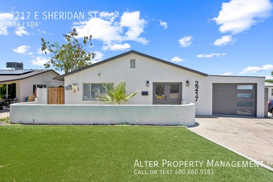 This spacious residence features modern upgrades throughout, offering a perfect blend of comfort and style. The open-concept layout includes a bright, updated kitchen, generous living areas, and tastefully renovated bathrooms. With five well-sized bedrooms, including a luxurious primary suite, there's plenty of space for family, guests, or a home office setup. Step outside to enjoy the nicely landscaped backyard—ideal for entertaining or relaxing—and take advantage of the large storage shed for extra space and convenience. This turnkey home combines functionality with modern charm, all in a great Phoenix location close to schools, shopping, and freeways. Pay only half for your first month. A must-see!