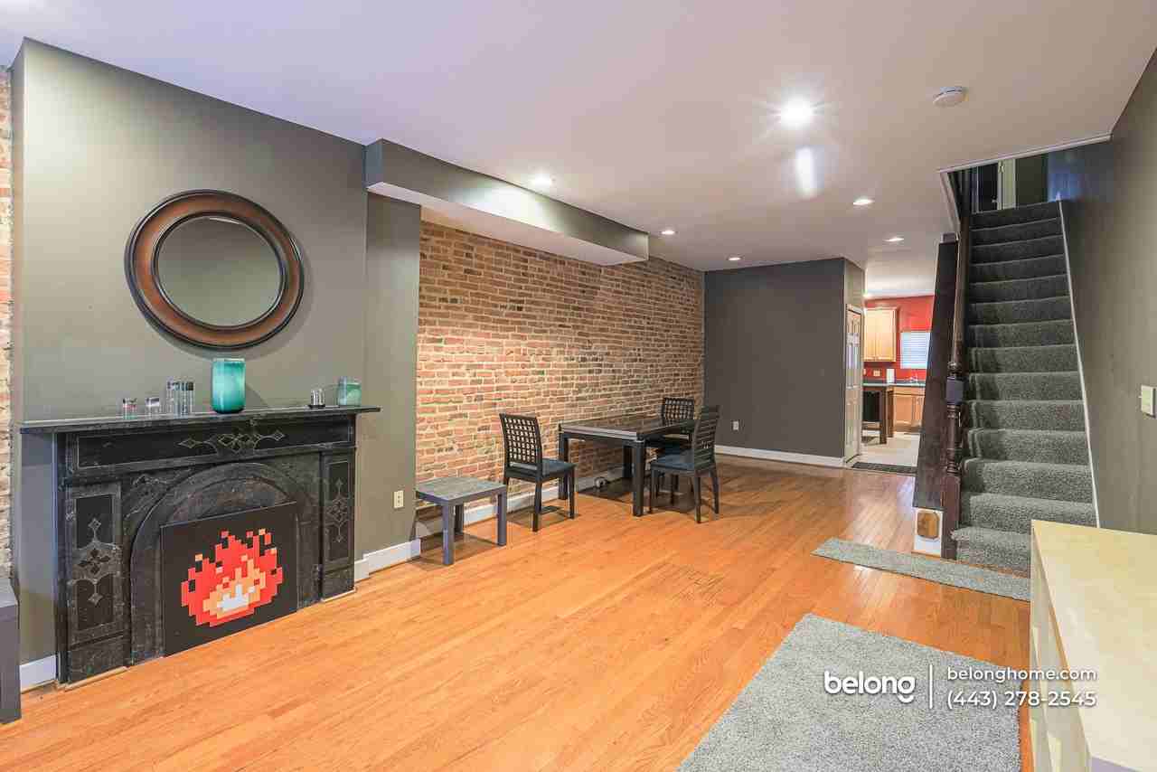 A cheerful violet door and handsome brick façade set the stage for this inviting 3-bedroom, 2-bath home near Patterson Park. Step inside to find exposed brick walls, tall windows, and hardwood floors that bring both charm and warmth to the open living and dining area. Recessed lighting brightens the space from front to back, while a decorative mantel adds character and makes the room feel like a true centerpiece for daily life. The kitchen is designed for function, offering plentiful cabinetry, generous counters, and a gas range ready for home-cooked meals. A movable island with a sleek metal worktop provides extra prep space or a serving station when guests come by. Tile flooring makes cleanup simple, and a stacked washer and dryer are tucked nearby for convenience. Three versatile bedrooms adapt to your lifestyle - whether you need restful retreats, a home office, or creative space. Two full bathrooms support the daily routine, giving everyone comfort and convenience throughout the week. Out back, a private, fenced patio extends your living space with room for grilling, container gardening, or a café-style table where you can relax in the open air. And with Patterson Park’s trails, fields, and festivals just around the corner, plus easy access to Canton’s shops, dining, and groceries, your neighborhood offers as much to love as the home itself. *Fireplace is for decorative use only and cannot be used without consent from Belong. *Our homes come as-is with all essentials in working order. Want upgrades? Request it through the Belong app, and our trusted pros will take care of the rest!