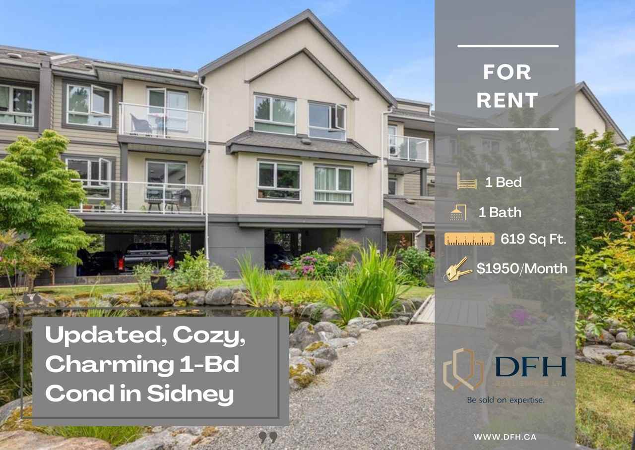 Charming top-floor 1-bedroom condo in beautiful Sidney by the Sea! This bright, south-facing unit is tucked away on a quiet street with a peaceful park and pond setting. The kitchen features stone countertops and opens to the sunny living/dining areas with vinyl plank flooring. Enjoy treed views from the private balcony. The spacious bedroom includes a walk-through closet and a 4-piece ensuite. In-suite laundry with extra storage, covered parking, and a separate storage locker. Just steps to Beacon Avenue’s shops and cafes. No pets SORRY!!