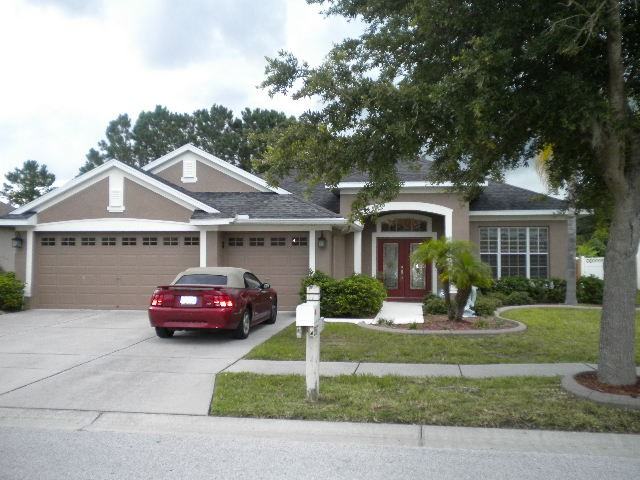 This is a beautiful Land O Lakes pool home with a 3 way split bedroom plan. The large eat-in kitchen has 42 inch cabinetry, snack bar, center island, matching stainless steel appliances and lots of counter space. The large family room has built in niches and beautiful architectural details. Spacious Master Suite has two walk-in closets, garden tub, separate shower and two vanities. Huge extended lanai with sparkling pool inside private fenced backyard. Washer, dryer, lawn care and pool care are included. Conveniently located to the library, county recreation center with pool, tennis courts and baseball fields. Owner will paint two of the smaller bedrooms a neutral color if requested.