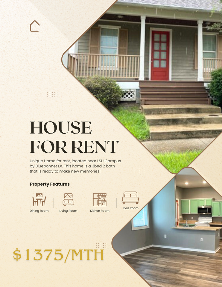 - Single-Family Home for Rent Near LSU Comfortable • Convenient • Move-In Ready - This charming 3-bedroom, 2-bathroom home is located near LSU and ready for its next tenant! - Rent: $1,375.00 month / Security Deposit: $1,375.00 -Appliances Included: Microwave Stove Refrigerator Dishwasher No Pets -Perfect for those looking for a clean, simple home in a great location close to campus. Near LSU – Don’t Miss Out!