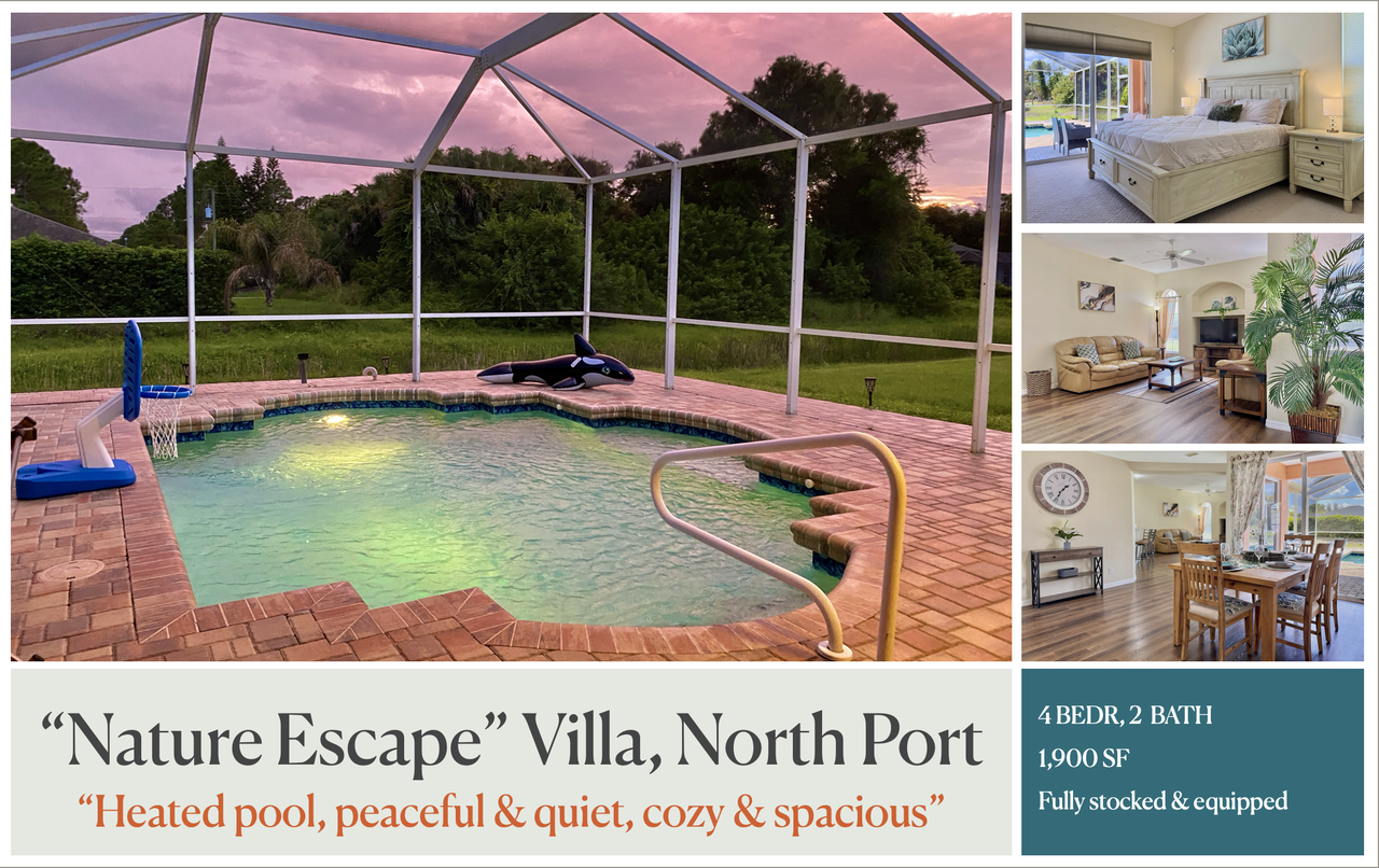 Welcome to this All-Inclusive fully furnished and fully equipped 4 bedoom 2 bath pool home! We invite you to relax and enjoy your time in this modern, spacious, fully furnished and thoughtfully stocked home away from home, that features: ~ 4 bedrooms, 1 main and 1 en suite bathrooms ~ 1 king bed, 2 queen beds, and 1 twin bed ~ Fully stocked and equipped kitchen with all the cooking essentials including coffee maker, toaster, blender, pots and pans, utensils and more! ~ Spacious heated pool in a screened lanai with plenty of poolside space to hang out ~ Smart TVs in the living room and in the master bedroom. High speed internet to stream your favourite shows and movies. No cable. ~ Washer and dryer ~ 2 car garage ~ Conveniently located in a very quiet serene neighbourhood, but close to Hwy 75 and to all the amenities North Port has to offer, including warm mineral springs, golf course, aquatic center, major shopping and more! ~ Pets are welcome, for an additional one-time non-refundable cleaning fee of $150 (does not cover damages caused by the pet) and a refundable pet deposit of half month rent. Rent includes all utilities, high speed internet (wifi), pool cleaning and maintenance, and landscaping. Refundable security deposit is half month rent. Pet damage deposit is half month rent. ~ 9.5 mi/ 17 min drive to the Warm Mineral Springs ~ 23 mi/ 31 min drive to Venice beach- or 24 mi/31 min drive to Nokomis beach ~ 5.5 mi/ 13 min drive to Heron Creek Golf Club ~ 6.6 mi/ 13 min walk to McKibben park ~ 5.4 mi/ 13 min drive to North Port Aquatic Center ~ 22 mi/ 28 min drive to Historic Downtown Venice ~ 20.6 mi/ 26 min drive to Sarasota Memorial Hospital, Venice ~ 16.5 mi/25 min to Fawcett Memorial Hospital, Port Charlotte ~ 5.7 mi/ 11 min drive to Fawcett Memorial Hospital ER, Port Charlotte