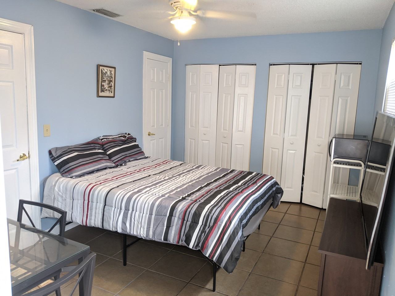 Fully furnished, private large 1 bedroom and bathroom with private entrance in a safe and quiet neighborhood. Still available as of today March 26th - Single Occupancy ONLY. No smoking/vaping and no animals due to allergies. - Employment/Paystub proof required. - $750 Monthly Rent. - $500 Refundable Security Deposit. - A Background check will be conducted. - Utilities Included: water, electricity, and WiFi. Please, keep in mind that due to home insurance restrictions, there is no kitchen available. No cooking is allowed in the room. However, you are welcome to use the gas grill outside on the patio. Thank you, Gerardo The room comes fully furnished with a queen bed, small fridge, microwave, and dining table. (TV not included).