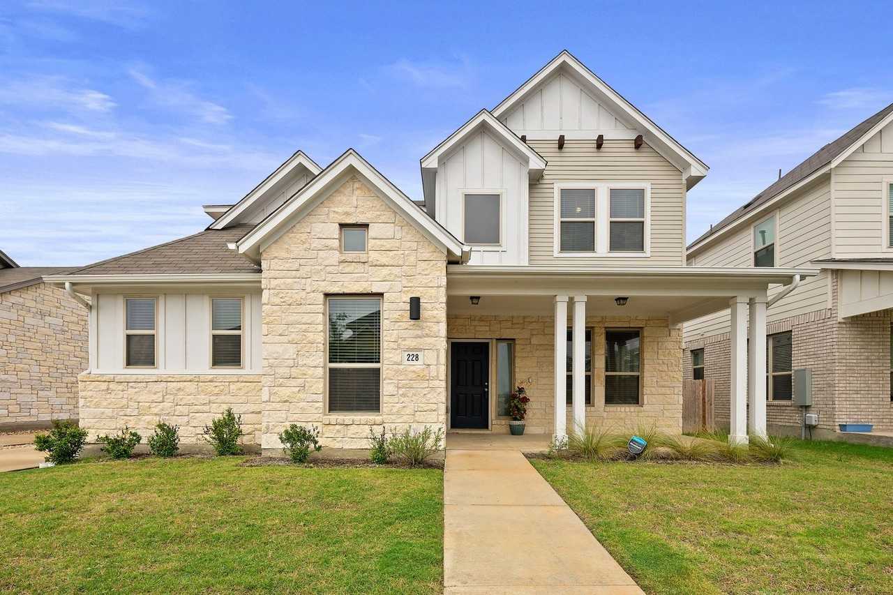 Move-in ready! This stunning home at 228 Rieber Rd in Kyle, TX, 78640, features the popular Waverly floor plan with modern design and luxury upgrades throughout. Upon entering, you'll find a private home office with glass French doors, ideal for work-from-home opportunities. The main living room, dining room, and kitchen boast soaring ceilings, creating an impressive feeling of openness, while numerous windows flood the space with natural light. The designer kitchen is a chef's dream, featuring a huge central island with ample seating, 30” Kent Moore oak cabinets with crown molding, stainless steel appliances, Silestone quartz countertops, and a large pantry for ample storage. The downstairs master suite is a perfect retreat, offering large dual vanities, a spacious walk-in shower, and a sizable walk-in closet in the primary bathroom. Upstairs, you'll find three sizable bedrooms, a guest bathroom with dual vanities, and a bonus landing perfect for a study or reading space. Sage Hollow amenities include a fenced-in dog park and a brand-new pool area just in time for summer. The community feeds into highly rated schools, including Jack C. Hays High School. Pet-friendly, with a refrigerator included. Tenants will be required to sign up for the new Resident Perks Program at $25/mo per household.