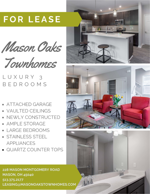 Property Id: 984946 Beautiful 3 bedroom, 2.5 baths with a garage. Stainless appliances, quartz countertops, a beautiful pocket community near downtown Mason. Perfect location, award winning schools, Call today, you don't want to miss this home. Call Cindy for more information. 513-375-2177