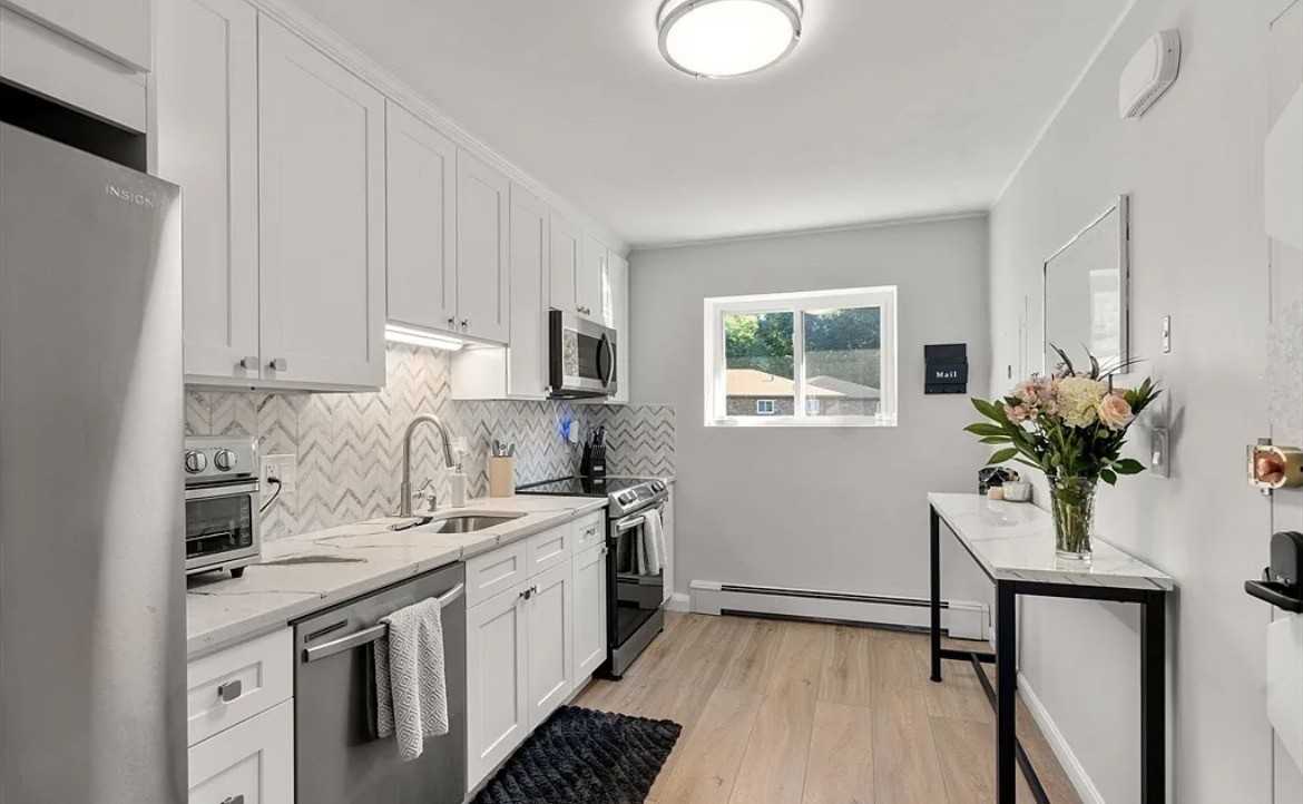 Located on the Brookline/West Roxbury line, this beautifully renovated top floor unit with a private balcony is in the charming Chestnut Village community. This condo has a stunning kitchen with stainless steel appliances, quartz countertops, white shaker cabinets, and a stone backsplash. Throughout the unit you have luxury wide plank vinyl floors, recessed lighting, great closet space, updated windows, and a built-in wall AC. Enjoy the chic bathroom with marble floors and designer grade tile. This complex is a close drive to multiple shopping centers, grocery stores, restaurants, and other conveniences. Chestnut Village offers amenities like an inground swimming pool, tennis courts, playground area, and in-building laundry. One parking spot is included and ample visitor parking spaces are available.