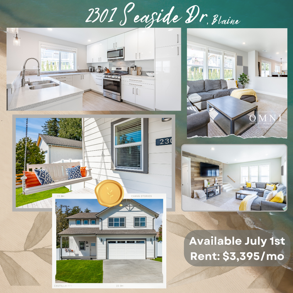 This stunning 3 to 4 Bedroom, 2.5 bathroom home is located in a desirable quiet cul-de-sac in Blaine WA. This spacious house features an open main floor with an attached garage. The home opens into a great entry area with a 1/2 bath for your guests' convenience. The living room has lots of windows for natural light and has a feature wall with natural wood. With a step-up into the dining room with access to the backyard and kitchen. The kitchen is equipped with stainless steel appliances, a gas range, and a dishwasher for convenience, as well as an eat-at-bar with plenty of room for 4 stools. Upstairs you will find a well-appointed primary suite with a large walk-in closet and a bathroom that features 2 sinks, a stand-up shower, and a soaking tub. The 2nd level also boasts peekaboo views of the bay from several windows and includes 2 other bedrooms and a full bath off the hallway as well as a large bonus room which would be great for a large 4th bedroom or a family room/office. The home's exterior features a beautiful front porch and a fully fenced backyard. The back deck sits between two patio areas great for outdoor cooking a family activities. Wooded trail access through Montfort Park to Drayton Harbor and gorgeous sunsets. Bike easily (1.5 miles) into downtown Blaine Starbucks/Edaleen Dairy. Raised garden bed ready for planting. Plus additional storage shed in the side yard. Tenants are responsible for all utilities and landscaping maintenance. One Dog is possible with approval, Deposit, and Fee. No students and no smoking. All information provided is deemed reliable but is not guaranteed and should be independently verified. A $50 fee ($45 application and $5 processing fees) is required for each application. If approved, a $65 administrative fee is required. THESE FEES ARE NONREFUNDABLE. For more information and to see all of our listings please visit our website at www omnileases com or give us a call at 360.746.9613. OMNI Property Management, 909 Squalicum Way Suite 107, Bellingham WA 98225