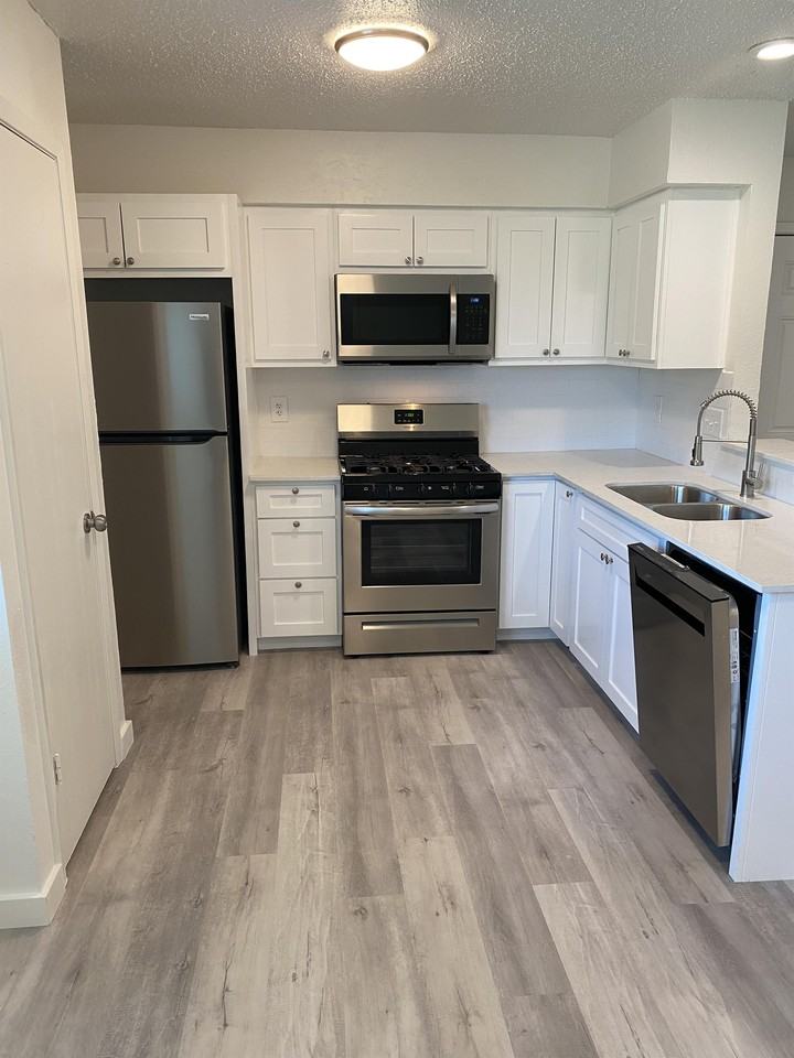 - Quartz counters, white cabinets