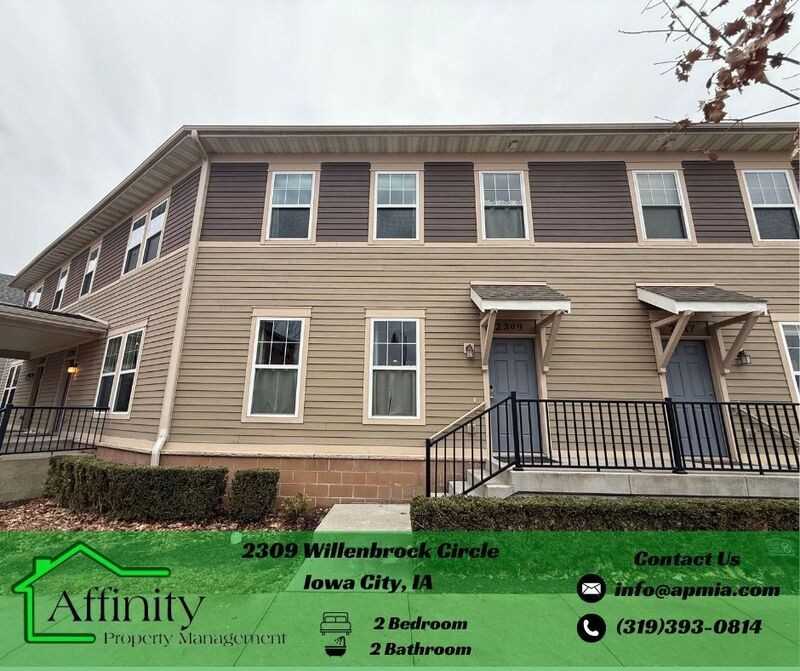 Spacious and well-maintained 2 bedroom, 2 bathroom two-story condo located on Iowa City’s east side. The main level features an open living area with great natural light, a functional kitchen with ample cabinet space, and a full bathroom. Upstairs offers two comfortable bedrooms, a second full bath, and convenient laundry. Located in a quiet residential neighborhood with easy access to I-80, shopping, restaurants, parks, and the University of Iowa campus and hospitals. Ideal for professionals, small families, or roommates seeking low-maintenance living in a great location. Landlord Responsibilities - Utilities and Services: - NONE + Lawn Care and Snow Removal Tenant Responsibilities - Utilities and Services: + Electricity + Gas + Water/Sewage/Recycling/Garbage Averages available upon request Pet Details: Pet(s) Allowed: Limit of 2 | Up to 65lbs | Breed Restrictions Apply | Updated Vax Records Pet Fee(s): $40 Per Pet/Per Month Affinity Property Management is proud to offer deposit-free living to qualified renters through Obligo! We understand that moving costs can add up, so we want to extend financial flexibility to our residents. When you move in with us, you can skip paying a security deposit and keep the cash for activities you care about. Learn more about the benefits of deposit free living here: Additional Disclaimers: *Application Fee(s): $40 Per Adult *Application Process consists of credit and criminal background check, income requirements, and rental reference checks. *Affinity Property Management reserves the right to deny applicants with a previous eviction, unpaid balances, and criminal history.