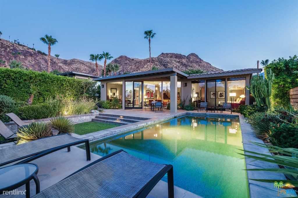 Now available for lease. Smokewood Palms is a nicely furnished modern villa with private backyard & pool, and it is conveniently located in the quiet south Palm Springs neighborhood of Araby Cove. It is just minutes to the Smoketree shopping centers and downtown Palm Springs. This immaculate home features two bedrooms with king beds and two bathrooms. The master bedroom features an en-suite bathroom with dual vanities, walk-in shower & large closet, and it has easy access to the pool. The large living area is comfortably furnished, and it also offers beautiful views of the backyard, mountains, and the city lights beyond. The well-appointed chef's kitchen features stainless steel Viking appliances including gas range/oven, refrigerator & dishwasher. The lush backyard is perfect for enjoying the Palm Springs lifestyle with a sparkling pool & spa, outdoor dining area, and lots of privacy. This home is also solar-powered for low electricity bills. Sorry, no pets. 051192264JP20577018 Please call 760-358-6200 **** Listing provided by Brad Hudson of BD Homes-The Paul Kaplan Group (LO State License:01325548) 760Leases. com No Pets Allowed