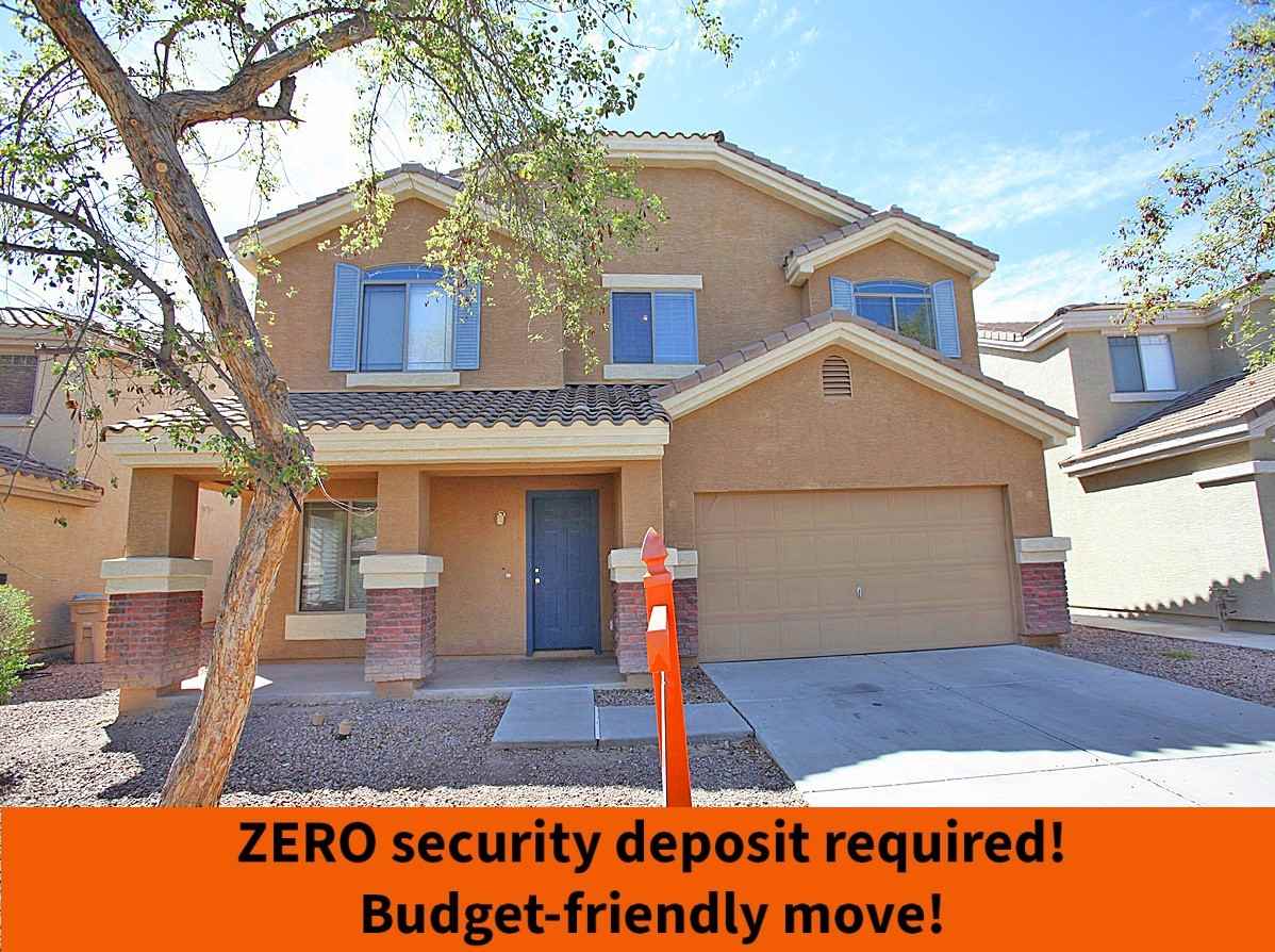 ** ZERO security deposit required! Budget-friendly move! + NEW FLOORING DOWNSTAIRS** 4 Bedroom + 2.5 Bathroom + Loft in Buckeye. Kitchen features stove/range, dishwasher, built in microwave and pantry. Ceiling fans and blinds throughout. Large loft area. Both full bathrooms have dual sinks. Master suite includes walk in closet, dual sinks and tub/shower combo. Covered patio and large backyard. Easy to maintain landscaping. 2 car garage with opener. *Viewings with Tenant Turner*