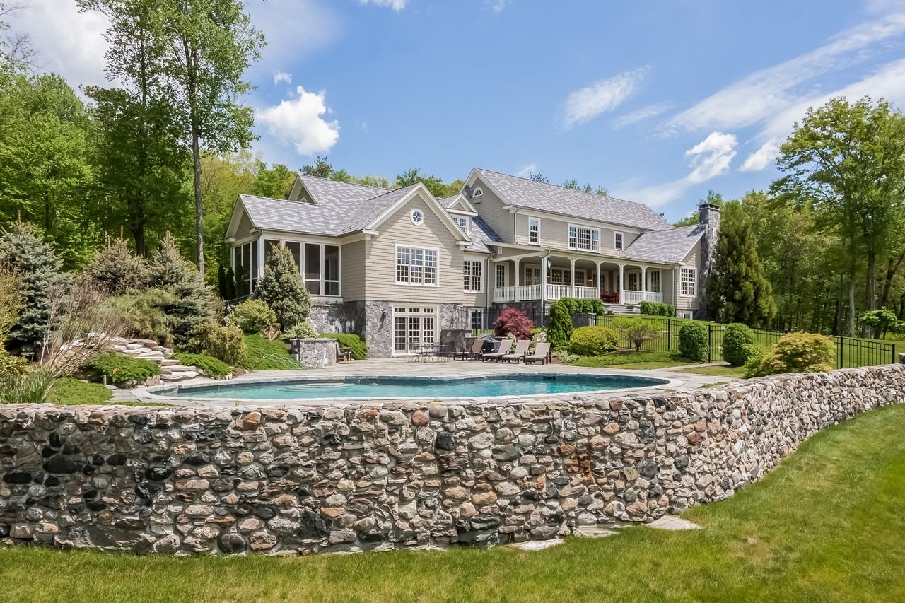 Annual rental of $10,000/month. This Shingle Style residence is sited atop 20+ high, private acres to take advantage of the spectacular 270-degree views. Every amenity and finest quality materials. Rooms are generous in scale with high ceilings, elaborate moldings, and wood flooring. The Living Room has a fireplace and 2 sets of French doors that open to an expansive bluestone patio overlooking the heated Gunite pool and stunning views. The kitchen with island, granite counters, cherry cabinets, commercial grade appliances includes 2 sinks and 2 dishwashers and opens to the light-filled family/morning room with its vaulted ceiling, fireplace and French doors. A wood-paneled library. First floor Master with a screened-in porch, tray ceiling, walk-in closet, dressing area and bath with Jacuzzi tub and separate shower. A second main floor bedroom has a full bath and walk-in closet. Second Floor. 3 bedrooms including another Master with large dressing room and 2 baths—one with Jacuzzi tub and separate shower; the other with a marble shower. The other 2 bedrooms have baths en suite. The Finished Lower Level is very light and opens to the patio surrounding the pool. There is a bath with 2 walk-in showers. A large family room and playroom. A guest suite includes a living room with fireplace. A wet bar adjoins the media room. Plus au pair quarters. There are two 2-car garages separated by a porte-cochere.