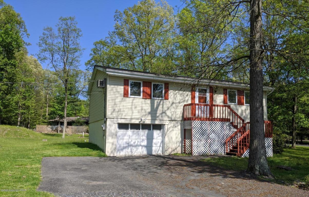 Four bedroom, 2 bath home in desirable Paradise Township - Pocono Mountain East school district. This home sits on a large, beautiful corner lot. Open living room, dining, kitchen area with vaulted tongue and groove ceilings and access to rear deck to enjoy time out in the fresh air! Two bedrooms and a full bath upstairs and an additional 2 bedrooms and full bath downstairs. 1 car attached garage with workshop benches. Shed. Walking distance to community pool and basketball courts.