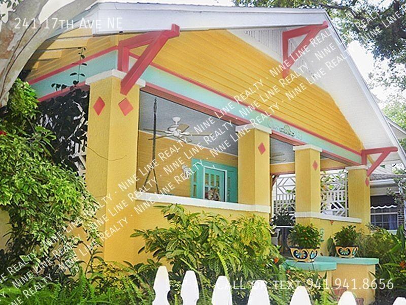 Three bedrooms, two baths, gas fireplace, large gourmet kitchen, granite counters, stainless appliances, chef's level gas range, big walk-in pantry, master walk-in closet, laundry room with washer/dryer and counter space. Charming gardens, big garage, cable TV and wifi . . . plus a porch swing. Big comfortable home This spacious home has a front wing (with two bedrooms and bath) and a back wing (with master bedroom and bath). Kitchen is central. Lots of privacy. The Winnie Belle sits on a quiet brick street in the heart of historic Old Northeast. Not so little at 1,785 square feet. The large one and a half car garage is attached to the house. Lots of room to store extra stuff. Plus, there is ample parking on both sides of the street. A funky shell chandelier in dining room Faux white-washed shiplap planks in living and dining room. Fireplace surround refinished in light drift wood tones. Hand painted ceiling medallions rich with color give the bungalow an elegant beach cottage feel. Fireplace is gas (in case the weather gets cool). No need to haul in wood. Just flick the button. Two bedrooms & bath in front of house Two bedrooms are off the living room. The smaller one has many useful built-ins including the twin bed. It also doubles as an office. The French doors in the other bedroom open onto the front porch to let in light and breezes. Between the two bedrooms is the bath. Recently rehabbed, back to the original vintage look. Glass tiles in shades of blue, white bead board walls and a tiffany-style light fixture give it that coastal look. The old claw foot tub is not old. It is even better. Pedestal sink has ample room for towels and bathroom stuff. Large chef kitchen Kitchen is large enough for a cooking demo. Plenty of storage in cabinets with a peninsula that can be used for cooking, eating or a grand buffet. Stainless gas range with cooktop is impressive. Chef quality. Nearby is a separate walk-in pantry. Family room conveniently next to the kitchen With an open floor plan, kitchen looks into the family room. Very sunny with a row of windows. Private garden off master bedroom The master bedroom has an ensuite bath and two closets. One a walk in closet. Two sinks in bathroom separated by tall cabinetry allow two to use the bathroom at once. Master shower has extra controls and pressure adjustments. The French doors off the master bedroom open onto a small private deck enhanced by a unique collection of Florida plants. Ever see the 8” blossom of a dutchman's pipe vine? Good place for a cup of coffee in the morning. Convenient laundry room This home has a full laundry room with cabinets. Extra counter space, too. Tropical flowers thrive in the garden Ground orchids in purple and yellow thrive in the front yard as well as pink tea roses. Not a big backyard, but big enough for a love seat and chairs and coffee table. Six foot fence covered with fragrant jasmine vine gives extra privacy. The backyard is easily accessed from the family room. In the heart of Old Northeast For a bungalow, this one is big, but on the outside it retains the charming cottage look. Great location. It is a nice walk to town. Stroll through a neighborhood of craftsman and Mediterranean homes or walk along the waterfront path leading to town. This large three bedroom is a delightful place to stay. Nice safe residential area and close to town.