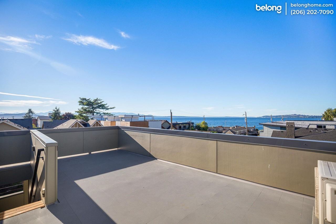 Amazing townhome in a serene neighborhood steps away from Alki Beach and Puget Sound! Enjoy the waterfront sunset as a resident in this end-unit premium home! Come home to cathedral ceilings, towering clearstory windows, oak hardwood, and tasteful finishes throughout. West-facing open floor plan with central A/C lets you enjoy seamless entertaining and abundant natural light. Cook up a feast in no time in your high-end custom kitchen - generous quartz counters, stainless steel appliances, and endless cabinetry ensure that all meal preps are hassle-free. The second and third floors showcase the roomy bedrooms, both having access to sleek full bathrooms. Enjoy a cup of coffee on your private covered balcony on the third floor, or enjoy outdoor lounging on your private roof deck while watching the Alki Beach sunset! Your new home comes with in-unit laundry and a coveted 2-car garage; and with the West Seattle Bridge re-opening on September 18th now is the perfect time to take advantage of all West Seattle has to offer, with the convenience of being 10 mins away from downtown Seattle! Tour your dream home today!