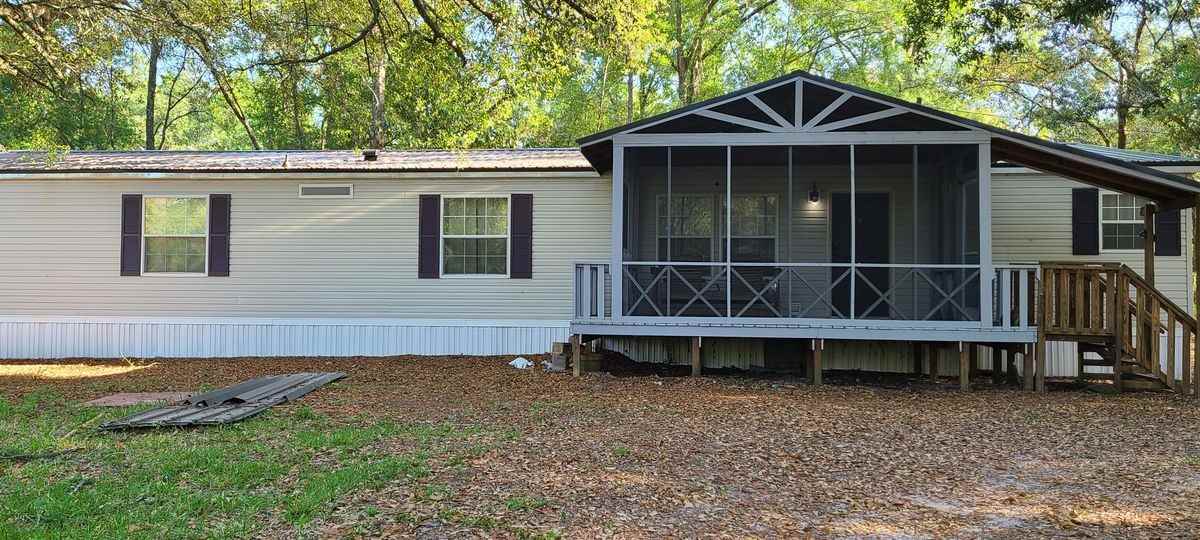 Nestled in the friendly district of Newberry, Florida, this charming yet spaciously designed four-bedroom, three-bathroom manufactured home offers an appealing blend of comfort and convenience. With a sprawling floor area of 2280 square feet, built in 2003, the house exudes a warm, welcoming ambiance that is sure to make you feel right at home. Undoubtedly, one of the key features of this home is its open floor plan and 5 acres of private property. Its generous layout is further highlighted by large windows that fill the rooms with an abundance of natural light, enhancing the newly installed vinyl plank flooring through out. The home also provides a promise of comfort with amenities such as central heating and cooling, ceiling fans, and a washer and dryer included for your convenience. This pet-friendly abode ensures an effortless lifestyle by offering country living, privacy, screened in front porch, a water cooler, a built-in entertainment center and a pool table. Mo...