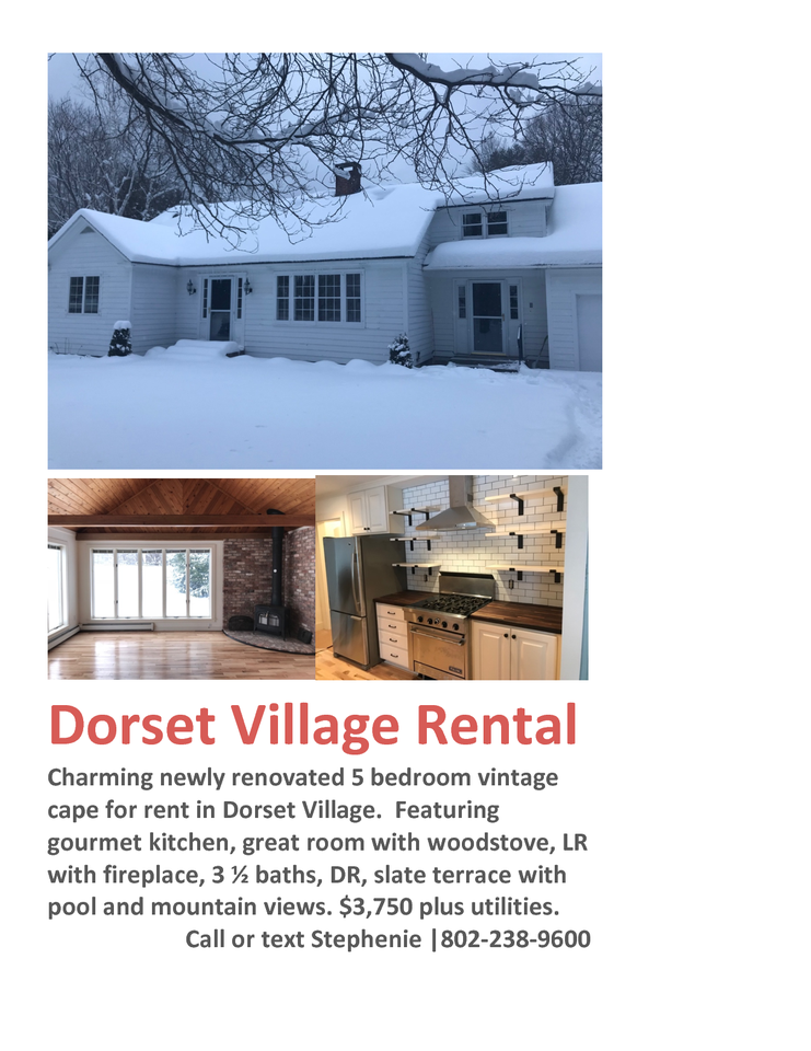 Charming newly renovated 5 bedroom vintage cape in Dorset Village. Featuring gourmet kitchen, great room with wood stove, living room with fireplace, 3 1/2 baths, dining room, slate terrace with pool and mountain views.
