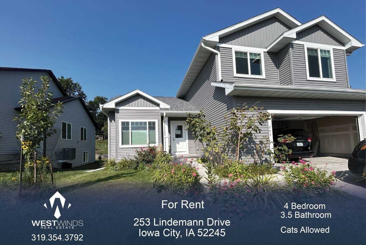 This 4 Bedroom, 3.5 Bathroom House is Available for an August 1st, 2025 Move In! 3D Virtual Tour- https my matterport com show ?m=2RtuUx3Znpe Video Tour- https youtu be TRmwXKLrsLs Copy this link to your browser to schedule a showing at your convenience. https secure rently com properties 4912739?source=marketing 4 Bedroom, 3.5 Bathroom single family home located in Iowa City! The living room features plenty of windows, LVP flooring, and gas fireplace. The exquisite kitchen features stainless steel appliances, granite counters, and access to private deck overlooking the beautiful backyard. A half bathroom with washer and dryer are located on the main floor. The primary bedroom with private ensuite, two additional bedrooms and one additional full shared bathroom are located on the top floor. The finished lower level features large rec space, an additional bedroom, and another full shared bath. Spacious 2 car garage attached provides ample storage space. Nearby grocery, restaurants, convenience stores, shopping, bus lines, parks, and more! Included in Rent * 2 Car Garage (Attached) Included in Rent Not Included - Tenant Responsibilities - Electricity & Gas: MidAmerican - Water & Garbage: City of Iowa City -Lawn Care - Snow Removal Additional Disclaimers *Photos/Floor Plans May be of a similar unit *Cat(s) are allowed for additional monthly fees Please visit our website for additional rental properties, for application details, schedule showings, and much more! https www westwindsrealestate com