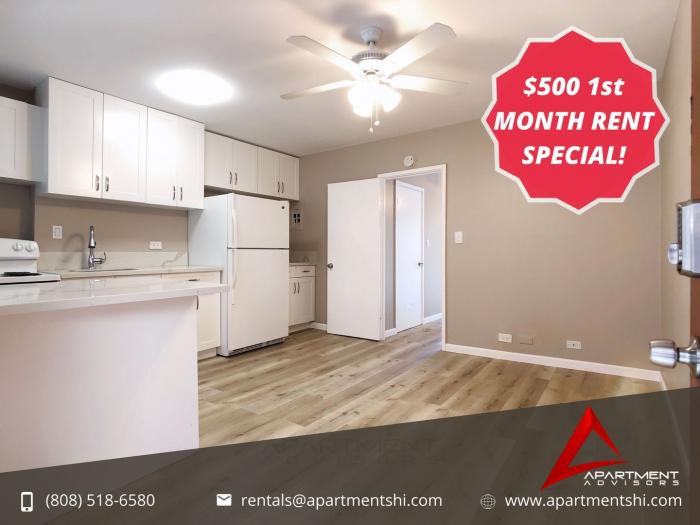 ---- SCHEDULE A SHOWING ONLINE AT: http showmojo com llz 4007cfc04a ---- *Advertisement is best viewed directly on Apartment Advisors Listing Webpage* COVID-19 UPDATE: Due to the recent impact of COVID-19, the well-being of our tenants, staff and community is a top priority. In efforts to continue facilitate showings of our rentals, we are taking the following precautions: - Social Distancing - We will be happy to meet with you for a showing, however we will maintain our distance (approximately 6 feet) and will you encourage you to do the same. - No Physical Contact - If you need assistance opening a door, testing a knob or anything else that would require you to physically touch something within the unit, please ask for our representative\'s assistance and we would be happy to help. - Limiting Showing Party Sizes - For any of the listed available times we have to show a unit, there will be a limit of 5 parties per showing. Furthermore, only 4 people may be inside the rental at any given time, including the showing representative. *Showing Priority may be provided to pre-qualified or pre-approved prospects. Website: www apartmentshi com Instagram: @apartmentshi To see this unit, please reserve a spot to an upcoming showing through this link: https showmojo com l 4007cfc04a Or Call: (808)-518-6580 The Street Number of this Rental\'s Address is: 2543 MONTHLY COSTS TO TAKE INTO CONSIDERATION: BASE RENT: $1,225 BUILDING SERVICE FEE (Sewer, Water, & Trash): $100 RESERVED PARKING STALL FEE: $100 *Electricity & Cable/Internet are Paid for by Tenant DIGITAL & REMOTE SHOWINGS / CONFERENCE CALL NOTES: - Appointments for digital showings are available upon request subject to pre-qualification questionnaire screening OR application preliminary screening and our availability to provide the service. - Duration: 15-20 Mins. KEY FEATURES Apartment: 1 Bed 1 Bath Parking: Reserved Parking Stall Included! Lease Duration: 6 Months (After the 1st Month Move-In Special for 30 Days) Pet-Policy: 1 Cat or 1 Dog OK (Restrictions Fee Apply) PROPERTY HIGHLIGHTS - FULLY RENOVATED! Full Kitchen! New Floors! Large Closet! - CONVENIENT WAIKIKI LOCATION! Near Bus Lines! Near Restaurants and Stores! - AVAILABLE NOW! Schedule for a showing using the link above! ADDITIONAL LEASE INFORMATION - 1 Cat or 1 Dog OK (Restrictions Fee Apply) - No Subsidized Housing *Advertised Rental Terms are Subject to Change at Any Time* ** Additional Building Service Fee, Parking Fee & Pet Fee, when Applicable, are not Included in the 1st Month Move-In Rent Special (30 Days)** RENTAL APPLICATION INSTRUCTIONS The following is needed to complete an online application: 1. Copy of Photo ID 2. 1 Month Proof of Income (2 Pay Periods of Pay Stubs) OR a statement letter signed by your employer with an estimate of your monthly income (Please provide your employer\'s contact information). 3. Bank Statement OR Screenshot of your Available Bank Balance *If anyone else above the age of 18 is moving in with you, they also need to complete a separate application, with the same requirements.* **If you are going to have a guarantor sign the lease with you, they also have to complete a separate application online, with the same requirements.** Application Fee: $25 per Applicant Any application that has not been fully processed will be issued a refund on application fees. Found at: www apartmentshi com listings ALL APARTMENT ADVISORS PROPERTIES HAVE A STRICT NO SMOKING POLICY *The security deposit is equal..