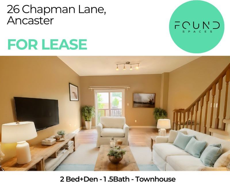 ๐ก You've found your next space - 26 Chapman Ln, Ancaster! ๐๏ธ Available Now (1-year minimum lease) ๐ $2,600 plus hydro, water, & gas (rent includes $38 for water heater rental fee) โ SingleKey Application Required โญ Professionally managed by Found Spaces Inc. ๐ $500 OFF your first month when you rent before October 1st ๐ ๐ฒ BOOK A TOUR: https app tenantturner com qualify 26-chapman-lane?p=TenantTurner Beautiful 3-storey executive townhouse for rent in Ancaster... โจ Key Features: This 2-bed+den, 1.5-bath home is nestled in the highly sought-after Shaver/Duffs Corners neighbourhood. Featuring a beautifully maintained full back deck on the ground floor, and private patio on the second floor. Perfect for those who love hosting! You'll love this darling interior with warm, rustic paint scheme, and spacious open concept. The kitchen comes fully-equipped with all new stainless steel appliances, dark wood cabinets, and pristine tiled flooring. Each bedroom comes with sizeable closets. The 4-piece bath boasts a spacious vanity, and glistening tub. Enjoy the added perks of ensuite laundry, attached 1-car garage with driveway, plus a full finished den with powder room in the basement. Guests can enjoy visitor parking privileges just around the corner. ๐ฟ The Neighbourhood: Enjoy being minutes away from the heart of Ancaster. A 2-minute walk to Wal-Mart Supercentre, and a 5-minute drive to Fortinos, Food Basics, and local gems such as The Brassie Pub, Lindley's Farm, and Lemongrass Thai Cuisine. Take the family down to Shaver Estates Park on the weekend. Located close to many public and high schools. Effortless access to the 403, and downtown Hamilton. ๐ Let's make finding your dream home a realityโ book your tour today! ๐