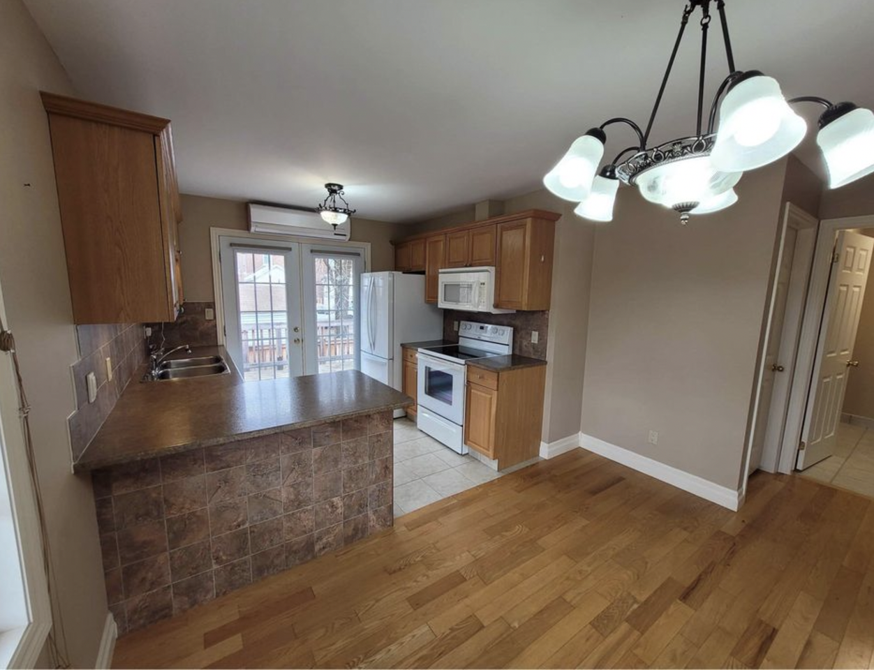 Spacious and immaculate 2 bedroom, one bathroom end unit townhouse for rent. Note: This townhouse is one level, there is no basement. -Minutes to downtown, close to restaurants, grocery stores, pharmacy, Hospital, Tim Hortons, etc. • Outdoor living space (three levels including a deck and two patios) clothesline, shed, and small grass area -In-suite laundry -2 Parking Spaces + 1 for a smaller vehicle -Air Conditioning