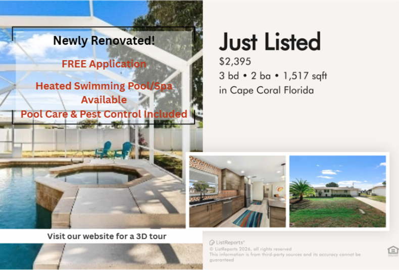 *** FREE APPLICATION *** For any questions regarding the property or the rental process please call or text (727) 666-5388 Beautiful 3 beds 2 baths Single-family home available for rent in Cape Coral with 10 Stars Property Management Welcome to your slice of Florida paradise! This beautifully located Cape Coral home sits just minutes from vibrant Downtown Cape Coral, the upscale dining and boutique shopping of Cape Harbour, and the waterfront fun at the Yacht Club Community Park with its sandy beach, fishing pier, and boat ramp. Enjoy quick access to Fort Myers, gorgeous Gulf Coast beaches, world-class boating, and endless entertainment along Del Prado Blvd. With top-rated restaurants, grocery stores, parks, and serene canals all around, this home puts you right in the heart of one of Southwest Florida's most desirable neighborhoods, perfect for anyone craving sunshine, convenience, and the true Florida lifestyle! 3D Virtual Tour: Click Here to Explore: https my matterport com show ?m=hmq6ne8QXQP Features: - Application fee will be credited back on the 1st month of rent if approved - Fully furnished home for move-in ready experience - Vinyl flooring with wood baseboard throughout the home for durability and easy maintenance - Stainless steel appliances that bring modern style and everyday convenience - Kitchen island for versatile cooking and entertaining spaces - Convenient dishwasher for easy cleanup after meals - Refreshing ceiling fans for enhanced comfort and airflow - Window coverings for added privacy and light control - Family room for relaxed gatherings and comfortable quality time - Walk in closet for ample storage and organization - Walk-in shower for modern comfort and accessibility - Laundry room equipped with washer and dryer for ultimate convenience - Car garage for secure parking and added storage - Screened-enclosed heated pool/spa combo for all-season enjoyment with added privacy - Fenced yard for comfortable, worry-free outdoor living - Pool Care & Pest Control included - Tenant is responsible for paying all utilities and lawn care services - First month rent and security deposit required Pets are allowed. No more than 2 pets per property. Weight limit of 55lbs per pet. No aggressive breeds. Applicants must complete a free pet application and have animal approved with vaccination record. The monthly pet fee will be determined by your pet screening score. Does not apply to medically/emotional support prescribed and/or service animals. Every applicant 18 years of age or older is required to complete a separate application. Each application is a $65 non refundable fee. A credit and background check will be conducted for all applicants, and management approval is required prior to signing the lease. See all rules and regulations at https 10starshomes com rental-guidelines All residents are automatically enrolled in the 10 Stars Resident Benefits Package at a cost of $7.99 per month. This program was developed to enhance the overall rental experience by providing added convenience, protection, and value throughout the lease term. Enrollment is required and cannot be waived. The package may only be initiated at the time of lease signing or renewal and includes a range of benefits designed to promote a more efficient, flexible, and secure tenancy. Renter's insurance required prior to move-in. Please see the link below for more details: https 10starshomes com resident-forms Renter's insurance required prior to mov..