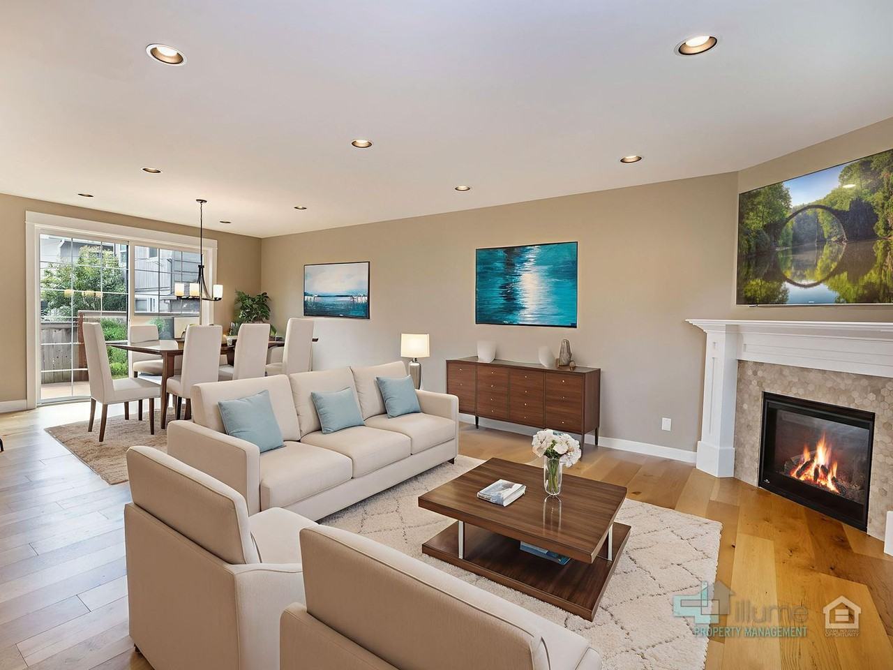 The property features hardwood floors, stainless steel appliances, and a gas fireplace, enhancing its appeal. It offers a prime location with nearby outdoor spaces and amenities catering to pets, including grooming services and hospitals. Additionally, it accommodates work-from-home needs with included utilities, quiet surroundings, and dedicated office spaces.