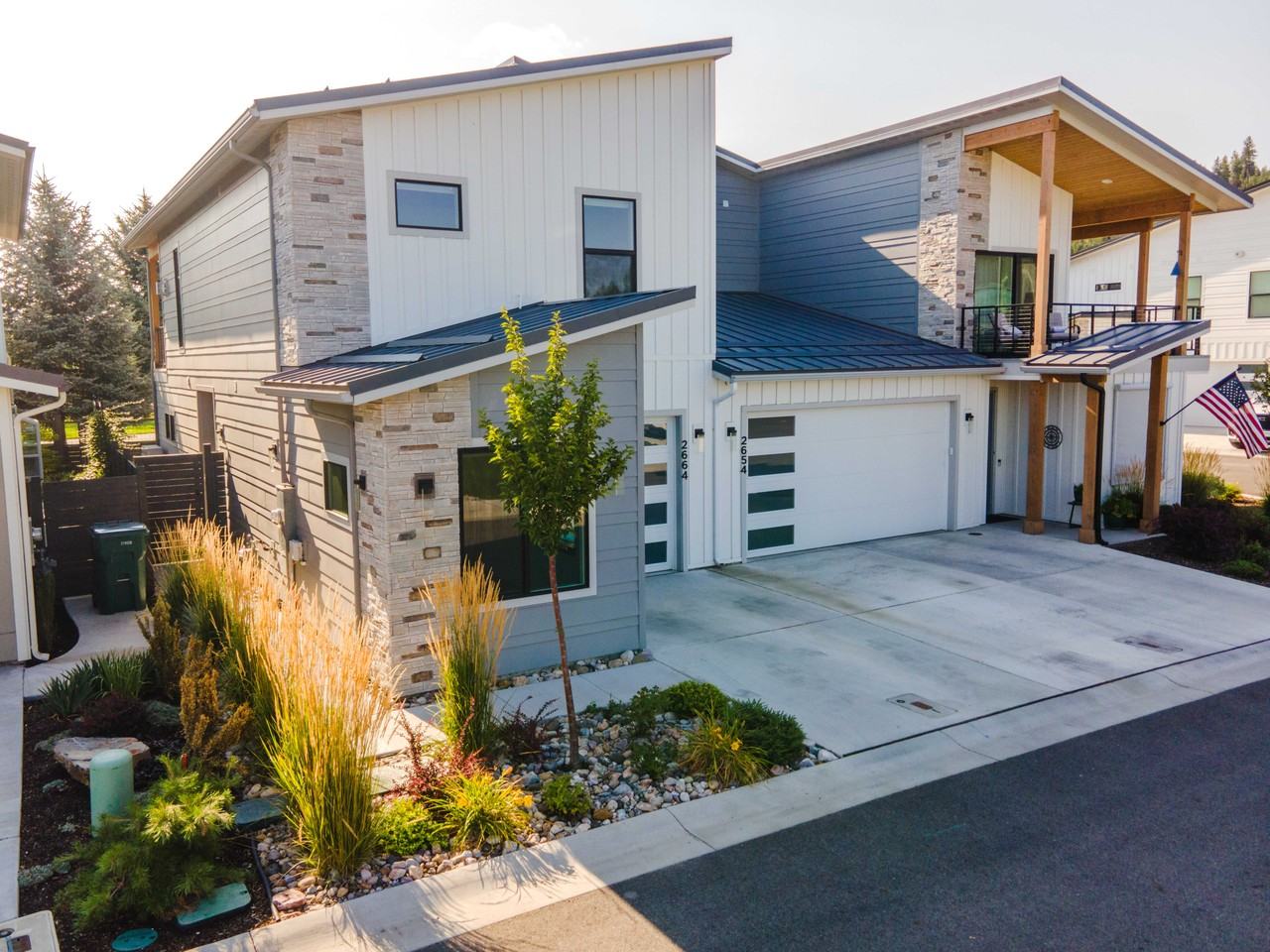 Beautiful modern townhouse in a small gated community very close to the Spokane River and the Centennial Trail. 2 Bedrooms and 2 bathrooms. Large modern fireplace in upstairs family room. Quartz countertops throughout, stainless steel appliances and luxury vinyl plank flooring throughout the downstairs and the upstairs family room. The unit is air conditioned. It has a downstairs patio and an upstairs balcony overlooking Riverstone Park. 1 car garage attached to the dwelling with a driveway for one car. This property is walking distance to Bardenays and Anthony's restaurants as well as Riverstone and its shops and cafes. Three houses away from the Spokane River and the Riverstone Dog Park.