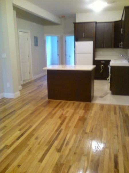 IMMACULATE 4 Bedroom in a Completely Gut Renovated Private House 4 bedroms 2 facing the front of the building 2 facing the back of the building 3 can fit queen sized beds 1 can fit a full size bed all bedrooms have closets and windows hardwood flooring throughout extremely high ceilings Mocha stained kitchen cabinets new appliances with a kitchen island top floor of the building deep soaking tub in the bathroom bathroom has glass mosaic tiling, and all new mocha colored vanity/sink living room is large kitchen is open to the living room but separated by a kitchen island