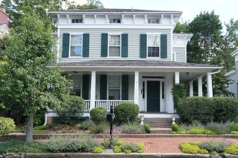 Unique 4 bedroom, 1 and 1/2 bath home with many original features. Formal living and dining room, eat-in kitchen w/ fireplace, open front porch, enclosed back porch, detached garage, basement. This unique Italianate style home in charming Quakertown Village features many original details including a wrap-around front porch, wide pine floors, built-ins, moldings, and high ceilings. The first floor includes a front foyer with walnut staircase, powder room, formal living room, dining room, and eat-in kitchen with wood burning fireplace. Upstairs are four bedrooms and an updated bathroom with a marble top vanity. An enclosed rear porch opens onto a bluestone patio and formal garden with gravel walkways. Includes a walk-up attic, full basement, and a large, detached two-car garage plus additional parking.