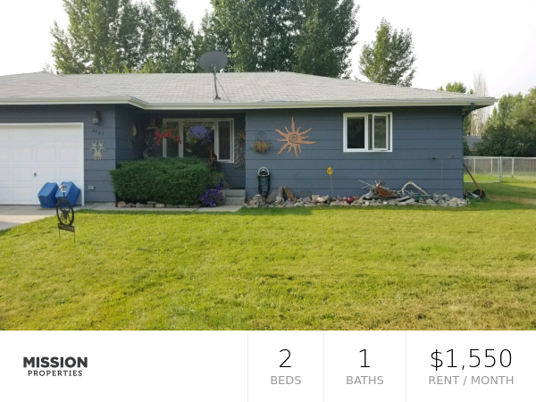 Two Bedroom Duplex with fenced yard, attached garage, and located on culdesac! Property Address 2707 Garland - Missoula, MT 59803 Available: 04/12/2021 Offered By Mission Properties Missoula | (406) 370-7474 Description This two bedroom one bathroom apartment is located on a quiet cul-de-sac (on the south side of town), with a central convenient location. It has updated flooring with laminate and tile, the bedrooms are carpet. The living space is open with a kitchen complete with a dishwasher. The sliding doors lead to the exterior concrete patio in your private fenced backyard that has underground sprinklers. There are washer and dryer hookups. The one car garage is attached. The heat is gas forced air. Tenant responsible for water and gas/power. Owner pays garbage and sewer and cares for common area grass (tenant responsible for lawn care inside fence). The lease is through end of May 2022, security deposit is equal to one months rent. Pets are considered at this property, additional security deposit of $300 and $35 pet rent per month. There is an online application process, you can find it at missionpropertiesmt. We are a small family run property management company, Mission Properties Missoula. Please call Jeremy with questions and for showings. Details * Beds/Baths: 2BD/1.0BA * Square Feet: 1,100 Rental Terms * Rent: $1,550.00 * Available: 04/12/2021 * Application Fee: $45.00 * Security Deposit: $1,550.00 www missionpropertiesmt com
