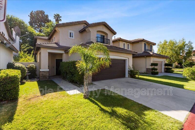 This stunning home offers great curb appeal with a well-maintained front yard and charming exterior. Step inside to find a formal dining area with an updated light fixture and gorgeous wood flooring throughout the main living spaces. The downstairs bathroom features an upgraded vanity, and large windows throughout the home allow for plenty of natural light. The remodeled kitchen is a chef’s dream, boasting an oversized island, custom cabinetry with ample storage, glass doors, a built-in wine rack, upgraded countertops with a stylish tile backsplash, and stainless steel appliances—including a hood over the oven. The open-concept layout flows seamlessly into the cozy living room with a fireplace, built-in shelving, and plenty of space to relax or entertain. Upstairs, you'll find a built-in desk area perfect for a home office or study nook. All three bedrooms are generously sized and include ceiling fans and mirrored wardrobes. The spacious primary suite features high ceilings, a walk-in closet with custom shelving, and a luxurious en-suite bathroom complete with dual sinks, an upgraded vanity, a separate soaking tub, and a walk-in shower. Additional highlights include an upstairs hallway bathroom with updated vanity and shower/tub combo, a separate laundry room with built-in cabinets, a 2-car garage, and a low-maintenance backyard with a grassy area and a peaceful sitting area. Located in a desirable community that offers a pool and spa, this home is conveniently close to top-rated schools, major freeways, parks, shopping centers, and great restaurants.