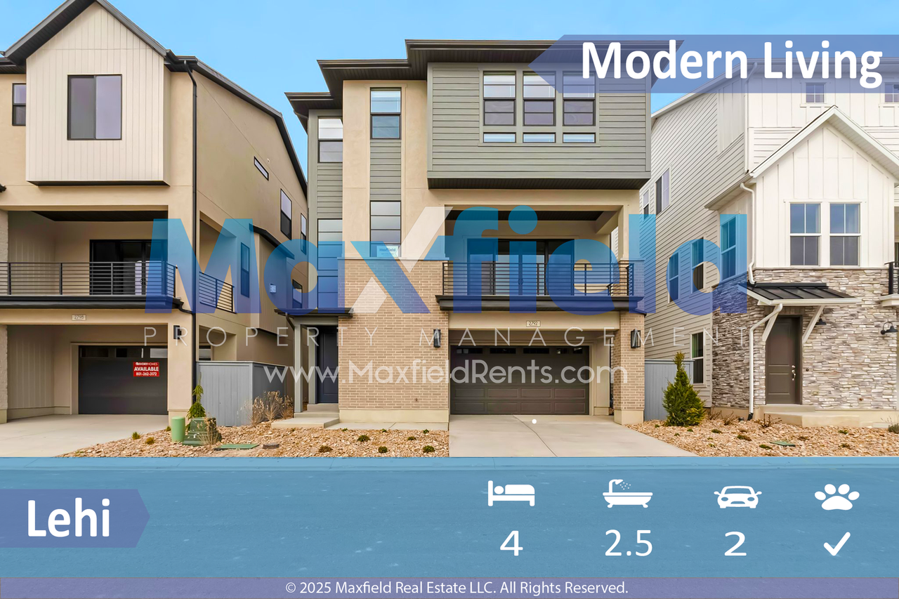 Welcome to this Modern 4BD 2.5 BTH Home in Lehi, UT! This stunning house features a spacious layout with 4 bedrooms and 2.5 bathrooms, perfect for comfortable living. The kitchen is equipped with stainless steel appliances, a gas stove, and a dishwasher, making meal prep a breeze. Enjoy the convenience of central air and air conditioning, as well as the cozy fireplace in the living room. The master bedroom boasts a private bathroom and a closet organizer for added storage. With a 2 car garage, fenced patio, balcony, and hardwood floors throughout, this home has everything you need for modern living. Also includes washer and dryer, don't miss out on the opportunity to make this beautiful house your new home! PETS: small pets considered with additional deposit and monthly pet fee based on pet. Visit MaxfieldRents. com pet-screening for more info. No Smoking or Vaping on the Property Showing by appointment only, to schedule a showing visit MaxfielldRents. com or call our Showing Hotline at 801.572.1300, option 1. Tenant Monthly Recurring Charges: * Advertised Rent; and * All Utilities (utilities vary by property and tenant usage) * Resident Benefits Package of $30 * $75 Community Fee that includes: Landscaping, Common Area Maintenance Residents are required to maintain a $100K Tenant Liability Insurance (PDLW) for accidental damage arising from fire smoke explosion, water discharge or sewer backup caused by negligent acts or omissions. Personal renter's insurance is recommended but not required. Tenants will be charged $17.00 per month if they do not have the PDLW with their renter’s insurance. Prior to move-in, tenants are required to pay a Refund Eligible Cash Security Deposit as advertised (typically one month’s rent) or have the option for using our Deposit Alternative. We offer Obligo, which lets you skip paying a security deposit in exchange for a small non-refundable monthly fee. There is also a one-time Lease Initiation Administration Fee of $150. All applicants over the age of 18 must fill out a separate application and there is a limit of 3 unrelated individuals and 2-3 vehicles depending on the unit. Beware of rental fraud and scams and from persons claiming they are getting rid of a property management company or use a google voice number. Please visit MaxfieldRents. com rental-fraud for more information. For a list of qualification guidelines please visit MaxfieldRents. com qualification-guidelines Download our app at MaxfieldRents. com App All information is deemed reliable but is not guaranteed and subject to change. Photos may be of similar units if a multi-family property. Property offered through Maxfield Property Management. We are committed to equal housing opportunities and provide housing opportunities regardless of race, color, religion, sex, national origin, physical or mental disability, or familial status. We Do Business According to the Fair Housing Law.