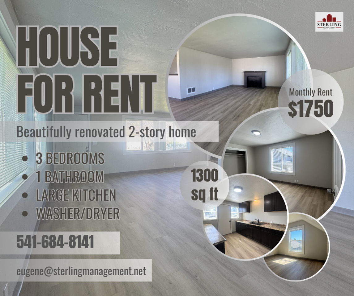 Welcome to this beautifully updated duplex in Springfield! It features brand new flooring, fresh paint, modern lighting, new window coverings, and more. The home offers a washer and dryer in the unit, a large open living room filled with plenty of natural light, and a spacious kitchen with granite countertops. Tenants are responsible for all utilities. Sorry, no pets. A 12-month lease is required. Open enrollment 4/3/26 @ 4pm Not ready for showing until 4/13/26 Please contact us today! Sterling Management Group 541-684-8141