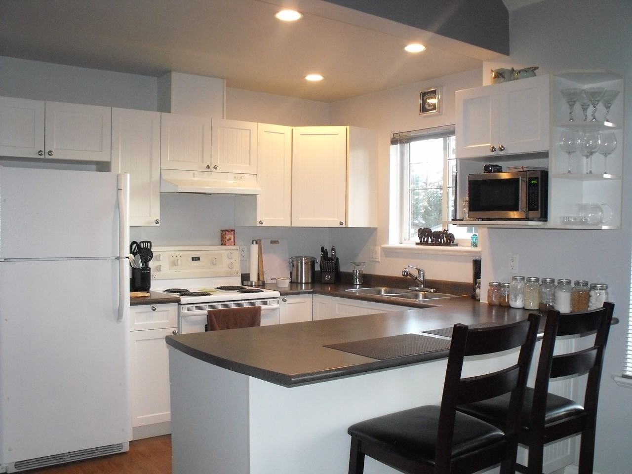 Available Feb 15, March 1st, or April 1st for the right people. This condo is more like a townhouse without a yard. You have a private entry from the back of the building where you enter the foyer which leads you up a flight of stairs to the main living floor. Here you will find an eating space, fantastic bright kitchen and big great room with 18' + Vaulted ceilings. The kitchen features an eating bar counter top and the great room has a big bay window over looking the street below. Down the hall you will find the bathroom with a nice deep tub and 4' Vanity and a low flow toilet (although water is included). Down the hall is also a linen closet and the second bedroom. At the end of the hall is the door to your balcony where BBQ's are allowed and your in suite laundry. Here you also will find the stairs that take you to the large master bedroom which has newer laminate flooring in it. The closet is a double bi fold closet. The best part, I think, is pets are ALLOWED (although some strata restrictions are in place). Water and Garbage pick up is included. No Smoking in the suite but the balcony is fine. If you have any questions please feel free to ask.