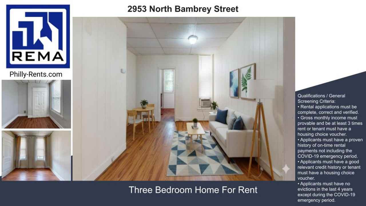 Virtual Tour: https my matterport com show ?m=djLydN3VAbf This two-story Philadelphia rowhouse offers a compact, functional living space that efficiently blends traditional and modern styles. The home is arranged with the main living areas on the ground floor and two bedrooms on the upper level, including a primary bedroom that provides a cozy sleeping space. Throughout the interior, hardwood floors add warmth and character, complementing rooms painted in neutral tones for a bright, airy feel. Large windows maximize natural light in the living areas and bedrooms, enhancing the sense of space. The layout efficiently includes two living areas, a kitchen, and a single bathroom. The kitchen features wooden cabinetry and a gas range, while the bathroom combines decorative textured wainscoting with a sleek modern light fixture. Built-in solutions, like a floor-to-ceiling closet in one bedroom, ensure space is maximized, offering a comfortable living environment despite its modest size. Qualifications / General Screening Criteria: • Rental applications must be complete, correct and verified. • Gross monthly income must provable and be at least 3 times rent or tenant must have a housing choice voucher. • Applicants must have a proven history of on-time rental payments not including the COVID-19 emergency period. • Applicants must have a good relevant credit history or tenant must have a housing choice voucher. • Applicants must have no evictions in the last 4 years except during the COVID-19 emergency period. Real Estate Management Advisors, LLC - REMA Licensed Real Estate Broker Property Manager Servicing Commercial & Residential Properties in the Philadelphia area. Check out more properties for rent at https www reinfo411 com rentals