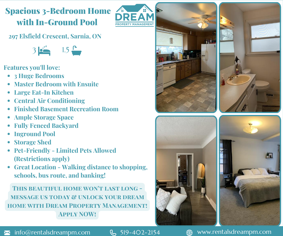 Spacious 3-Bedroom Home with In-Ground Pool Step inside this spacious single-dwelling home designed for comfortable family living. Tucked just behind Indian Road, this property offers a great balance of privacy and convenience, with shopping, schools, bus routes, and banking all within walking distance. Features You'll Love: -3 Huge Bedrooms - Plenty of space for rest, work, or guests -Master Bedroom with Ensuite - Added privacy and convenience -Large Eat-In Kitchen - Bright and functional, with direct access to the backyard -Central Air Conditioning - Stay comfortable year-round -Finished Basement Recreation Room - Ideal for movie nights, hobbies, or a play area -Ample Storage Space Extra Perks You'll Enjoy: -Fully Fenced Backyard - Private and secure outdoor space -Inground Pool - Perfect for summer entertaining and family fun -Storage Shed - Convenient space for outdoor tools and seasonal items -Non-Smoking Home - A clean and healthy environment for you and your loved ones. -Pet-Friendly - Limited Pets Allowed (Restrictions apply) -Great Location - Walking distance to shopping, schools, bus route, and banking! Location Highlights: *Schools: -Holy Trinity Catholic School (650m) -Lansdowne Public School (650m) -Saint Benedict Catholic School (850m) -Queen Elizabeth II Public School (900m) -Great Lakes Secondary School (900m) *Healthcare: -Clearwater Family Dental (2.0 km) -Clinic Sarnia (2.3 km) -Rapids Family Health Team (2.5 km) -Bluewater Health Sarnia (2.7 km) *Shopping & Amenities: -Food Basics (600m) -Real Canadian Superstore (1.9 km) -London Road Shopping Centre (2.2 km) -Downtown Market (3.2 km) Tenant Requirements: (Only qualified applicants will be contacted!) -Online Application: www rentalsdreampm com -First and last month's rent + Key deposit -Credit check & References -Tenant's insurance (plus coverage for the pool) -Tenant pays for all utilities Don't miss out - Fill out an application today and make this yours! -Email: **** -Call: 519-402-2154 -Online Application: www rentalsdreampm com This beautiful home won't last long - message us today & unlock your dream home with Dream Property Management! Apply NOW! *Disclaimer: Distances are approximate based on Google Maps. All information provided is deemed reliable but is not guaranteed and should be independently verified. Please note that all rental agreements must comply with the Residential Tenancies Act of Ontario.