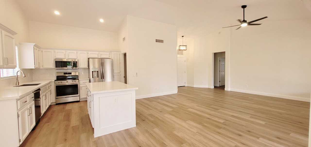 Gorgeous, fully renovated home, 3 bedrooms, 2 bathrooms in 55+ active community of Pebble Creek for a long term lease. Kitchen features brand new appliances, has plenty of cabinets, quartz countertops and backsplash, custom made large kitchen island. An open floor plan with vaulted ceilings & a bright, airy living space. New flooring through out, new blinds, new light fixtures and ceiling fans. Master bathroom has a privacy door. Large walk in closet in master bedroom. Garage with build in cabinets, new garage door opener and utility sink. Large patio with extended pergola, perfect for entertainment. Embrace your best life inside & out, including the gated Pebble Creek Golf Community & amenities. Rent includes garbage collection and monthly bug spray service.