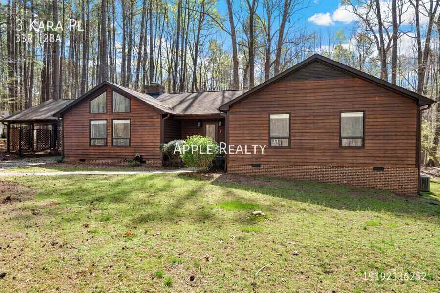 Newly updated 3-bedroom, 2-bath home offers quiet living on a private cul-de-sac in Durham, set on a spacious 0.98-acre lot with a very large yard and wooded surroundings. Inside, you’ll find fresh paint, luxury vinyl plank flooring throughout, and quartz countertops in the kitchen and bathrooms. The living room features vaulted ceilings, a gas log fireplace, and large windows that bring in abundant natural light. The primary suite includes dual vanities and a walk-in closet. Enjoy outdoor living on the screened porch overlooking the expansive backyard. Additional features include a 2-car carport, storage shed, and utility closet. Conveniently located near downtown Durham, Duke, major highways, and RDU Airport. Utilities are tenant responsibilities, as is lawn care. Pets are allowed. Schedule a showing for this amazing home today.