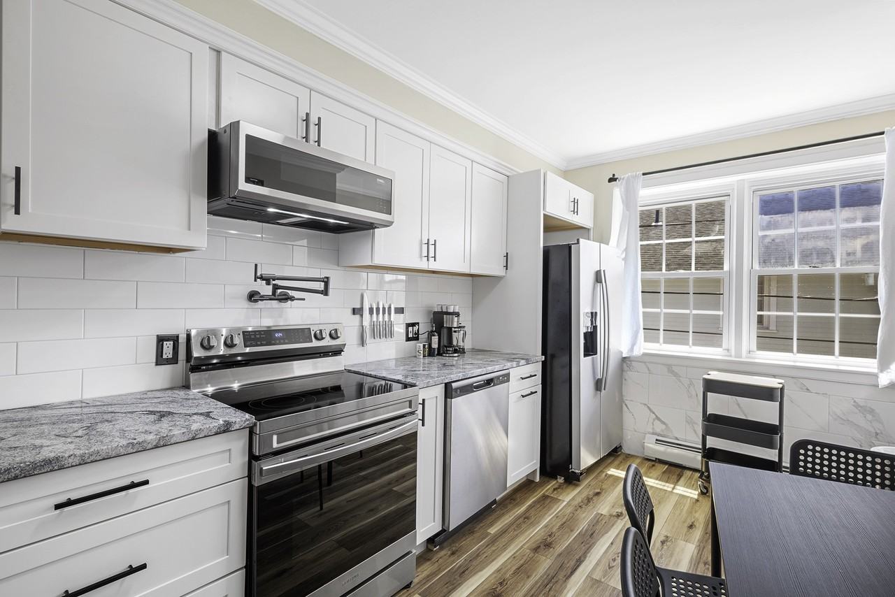 LUXURY APARTMENT - Located directly in Downtown Mystic, ranked a top vacation destination, steps away from the drawbridge, award winning restaurants, coffee, and bakeries and high end shopping, discover a 1,200 sqft penthouse suite with two bedrooms and one bathroom. This 2nd floor unit has just undergone an extensive renovation that spared no expense. Lifeproof vinyl flooring, gorgeous crown molding and wall trim throughout, and a fresh new paint job in every room. As soon as you walk in, you'll be greeted with a kitchen adorned with all new high end stainless steel appliances, heat resistant granite countertops, a huge farmhouse kitchen sink with a detachable multifunction faucet, and even a pot filler to make cooking a breeze. You'll love hosting guests in the spacious living room with views of Downtown Mystic and a massive TV already mounted right on the wall. The master bedroom has a king bed, a large closet, and views of the The Harp and Hound, an extremely popular Pub. The second bedroom has in-unit laundry and another large closet as well. Last but certainly not least, the bathroom will make you feel like you're living on a resort. Rainfall and detachable shower heads with multiple functions and LED lights, a smart mirror and high ceilings! The complex has a private dedicated parking lot and a shared lawn space packed with games and lounge chairs. Don't let this opportunity pass by-seize the opportunity to immerse yourself in the charm of downtown Mystic living in this hidden gem community. Only 20 minutes by car from Mohegan and Foxwoods Casinos. Walkable to train station with Amtrak lines to NYC and Boston.