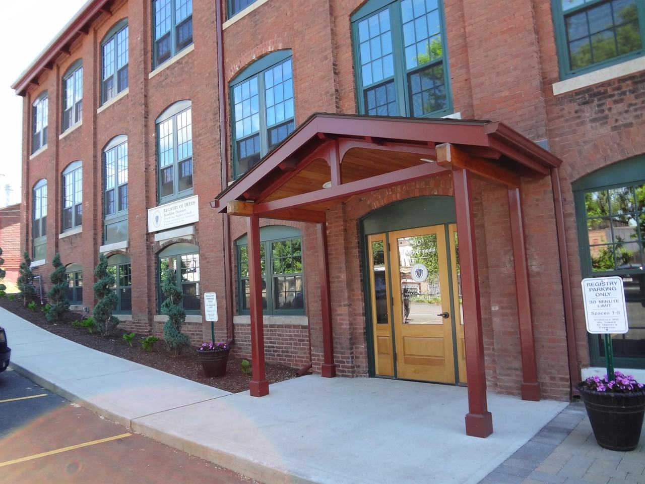 DESCRIPTION: Sunny, downtown office located on the ground floor in a mixed use, net-zero, historic, 1900s brick building near the Olver Transit Center and the Olive Street Parking Garage. Renovated, quiet, and clean with the rich, historical beauty of exposed brick, wood-timber ceilings, and mahogany hardwood floors. Apartments on the upper floors, using a separate entrance. UNIT AMENITIES: -Private en suite bathroom with tile flooring, mirror -Kitchenette with cherry cabinets, granite countertops, small refrigerator -Custom built-in mahogany and maple work-stations -Large triple-paned windows allow natural light, wood blinds included, energy efficient LED lighting -Furnished outdoor patio area -Non-smoking property -Fully sprinklered with remote fire alarm monitoring -Experienced, caring, and responsive property management INCLUDED IN RENT: -Includes water/sewer, trash/recycling, landscaping and snow removal. -Includes 3 assigned parking spaces, additional spaces available for rent PAID BY TENANT: -Heating/cooling (high efficiency forced air), electric, hot water MOVE IN REQUIREMENTS: -Rental application with landlord and income references -Credit, criminal, and eviction screening -3-5 year lease, negotiable -First month's rent, last month's rent, and security deposit equaling one month's rent SHOWINGS: By appointment. Please contact Adelle at 413-824-2508. Mixed use, net zero building with 2 offices and sixteen upper floor loft apartments Building Amenities: Renovated Energy Star 2 certified, historic 1900's brick building Multi use including ground floor commercial use and sixteen total studio and 1BR apartments Elevator and stair access to first, second and third floors Assigned parking space in private parking lot included in rent Coin-operated Energy Star washers and dryers in ground floor laundry room Triple pane windows with screens and wood blinds allow plenty of natural light and ventilation Solar hot water Hydronic hot water radiators (natural gas backup) Double sound insulated walls with soy-based spray foam insulation Sealed and exposed brick walls 10-13 foot tall ceilings with gorgeous wide, natural wooden beams, crown moulding, and ceiling fans Newly insulated roof Intercom for foyer entrance to secured building Fully sprinklered with remote fire alarm monitoring Non-smoking building Experienced, caring, and responsive property management Location: Situated at the Route 5/10 gateway to downtown Greenfield, this unit boasts easy access to Interstate 91 and Route 2 as well as being on the path to Town Hall, local schools, businesses, and the Franklin County Justice Center. The recently constructed Olive Street parking garage is across the street. The net zero Olver public transportation center is located next door which services Amtrak, Greyhound, Franklin Regional Transit Authority, and others.