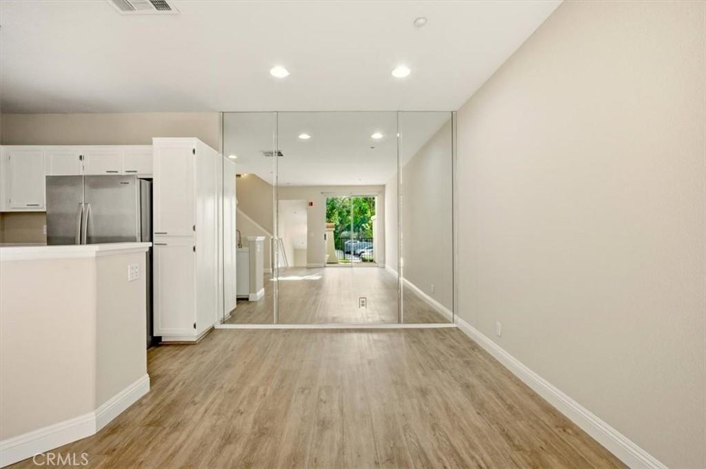 This stunning 1 Bedroom/1.5 Bath Townhome with Direct Access 2-car Garage is in perfect interior tract location overlooking a large grassy greenbelt with easy access to guest parking! Beautiful upgrades include wide plank laminate hardwood flooring throughout (no carpet!) NEW bright neutral paint, NEW fixtures, beautiful and extended height baseboards! Spacious master suite has a dual sink vanity and walk-in closet! Upgraded stainless steel refrigerator, washer and dryer are included! Enjoy the near by resort style amenities, including a private gym, swimming pools, spas, sports court, and tennis courts!