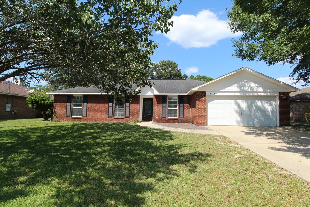 Southwest Pensacola 4 bedroom 2 bathroom brick home in a highly desired school district near NAS Pensacola and white sand Perdido Key Beaches. Beautiful new vinyl wood laminate floors have been installed throughout the home. This home features an eat-in kitchen plus a formal dining room. The contemporary kitchen has two-toned cabinets with stainless steel fridge, dishwasher, and built-in microwave with a pantry. Split bedroom floorplan with the primary bedroom separate from the other bedrooms. The primary bedroom offers a ceiling fan and a private ensuite bathroom. The primary bathroom has been remodeled with a large walk-in shower. The additional bedrooms are similar in size and share a full remodeled bathroom with a tub/shower combo and updated vanity. The indoor laundry room leads out to the 2-car garage. The large backyard is fully fenced with a patio, shed, and is shaded. This home is pet friendly on owner's approval with a $250 non-refundable pet fee per pet. The home is ready for immediate occupancy. This home offers ½ off-deposit for active duty military members.