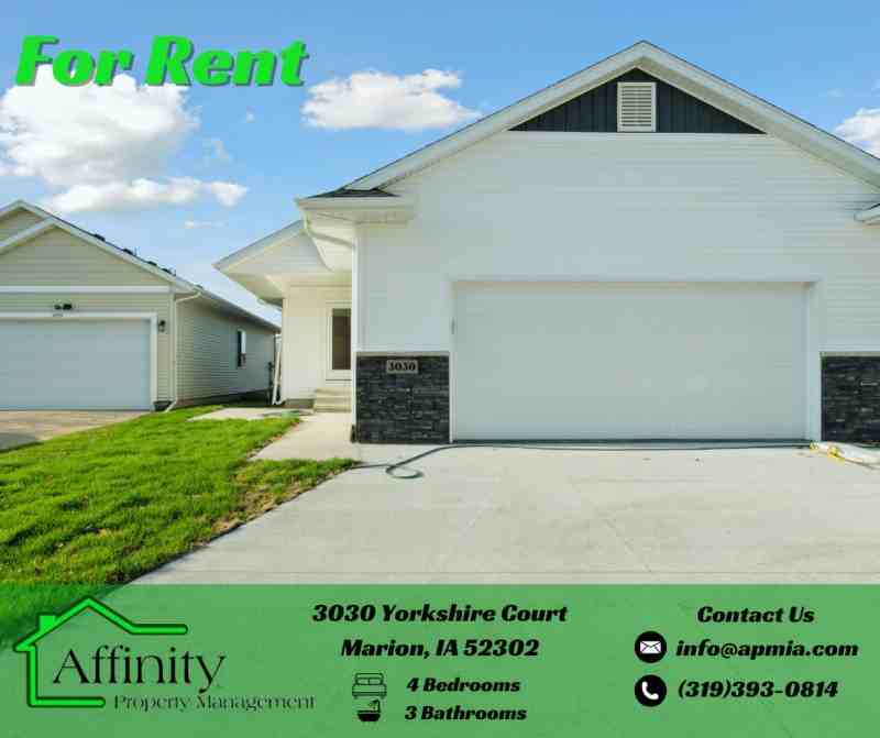 This charming home offers a seamless blend of comfort and style with an open-concept layout, perfect for modern living. As you enter, you'll be greeted by a spacious living room that flows effortlessly into the dining area and kitchen, creating an ideal space for both entertaining and everyday living. The well-designed kitchen features ample cabinetry, modern appliances, and a convenient layout that makes meal preparation a breeze. The master suite is a true retreat, complete with a large walk-in closet and a private en-suite bath, offering the perfect escape at the end of the day. Step outside to enjoy the beautiful covered patio in the back, an inviting space for outdoor relaxation or dining. The covered front porch adds curb appeal and provides a welcoming spot to enjoy the neighborhood. Located in a desirable Marion neighborhood, this home is close to parks, shopping, dining, and all the amenities you need for a convenient lifestyle. Landlord Responsibilities - Utilities and Services: - NONE Tenant Responsibilities - Utilities and Services: + Electricity: Linn Co REC - Monthly Average: $150** + Gas: MidAmerican - Monthly Average: $45** + Water/Sewage/Recycling/Garbage: - City of Marion - Monthly Average: $85** + Snow Removal: Bring Your Own Shovel! + Lawn Care: Bring Your Own Mower! **Monthly Average varies with individual use and may not accurately reflect average costs. Pet Details: Pet(s) Allowed: Limit of 3 | Up to 65 lbs | Breed Restrictions Apply | Updated Vax Records Pet Fee(s): $40 Per Pet/Per Month Affinity Property Management is proud to offer deposit-free living to qualified renters through Obligo! We understand that moving costs can add up, so we want to extend financial flexibility to our residents. When you move in with us, you can skip paying a security deposit and keep the cash for activities you care about. Additional Disclaimers: *Application Fee(s): $40 Per Adult *Application Process consists of credit and criminal background check, income requirements, and rental reference checks. *Affinity Property Management reserves the right to deny applicants with a previous eviction, unpaid balances, and criminal history. *Advertisement photographs and/or videos may be of a similar property. Affinity Property Management uses Tenant Turner to schedule all showings online. https app tenantturner com listings affinitypropertymanagement