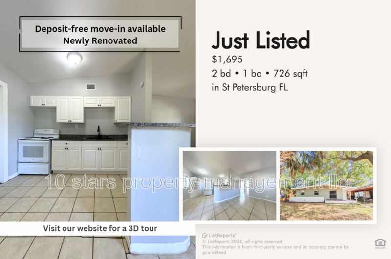 ** New listing with 10 Stars Property Management ** For any questions regarding the property or the rental process please call or text (727) 666-5388 Beautiful 2 beds 1 bath is available for rent in St. Petersburg, FL. This area offers a mix of urban convenience and outdoor attractions. Nearby parks include Campbell Park, providing walking trails, sports facilities, and picnic areas. Explore attractions such as Tropicana Field, home to the Tampa Bay Rays baseball team, offering games and events throughout the year. While beaches like St. Pete Beach and Fort De Soto Park Beach are within driving distance for a day of sun and relaxation. Major roads such as Interstate 275 and US Highway 19 provide convenient access to explore the wider St. Petersburg area and nearby cities. With its combination of amenities and outdoor recreation, this location offers a vibrant urban lifestyle with options for leisure and exploration. 3D Tour Available: https my matterport com show ?m=3KpZ3xhKjUT Features: - Tile floor throughout the property ensures durability and easy cleaning - Basic kitchen appliances provided for your cooking needs - Fully fenced yard offers privacy and security - Washer/dryer hookups provided for laundry convenience - Pets allowed: 2 pets under 25 pounds each and no aggressive breeds, $150 pet deposit per pet required - Tenant is responsible for paying all utilities and lawn care At 10 Stars, we offer multiple services to make your stay with us easy and comfortable. We have a same-day application approval and a quick move-in for no additional cost. Our team is professionally trained and will be able to assist with any leasing, billing, or maintenance issues our tenants have. We also offer an emergency line available 24/7 for any urgent cases. Tenants have access to an online portal where they can make rent payments, communicate with our team and get updates on their payments and maintenance requests at all times. THE FIRST MONTH AND SECURITY DEPOSIT ARE REQUIRED We do offer a DEPOSIT FREE MOVE IN option and a TENANT BENEFIT PACKAGE that includes: rebuilding your credit feature, cash back rewards, online portal access and free concierge service! Details on our website: https 10starshomes com move-in-without-a-deposit Renter's insurance is required prior to moving in. Rules and Regulations are on our website! www 10starshomes com Only $65 non-refundable application fee per adult with 10 stars property management